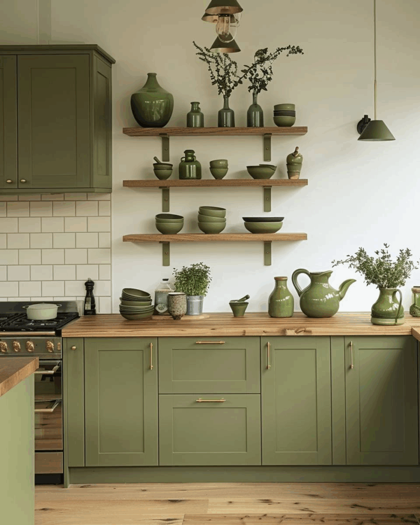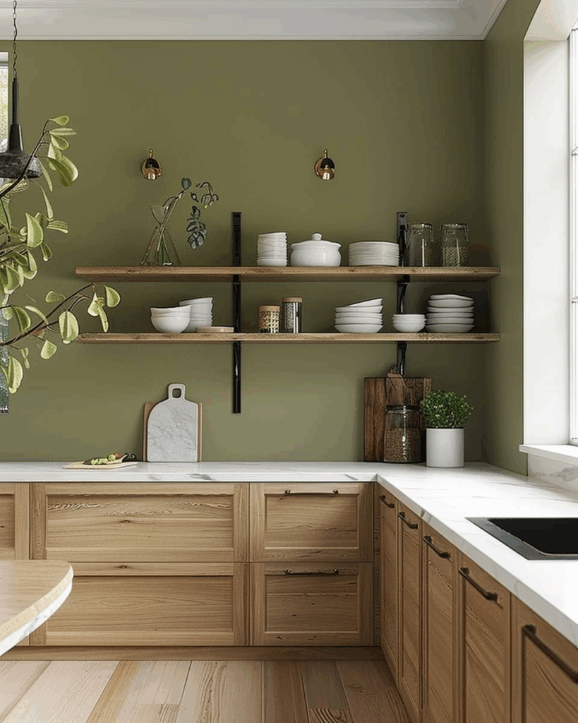 Setze auf offene Regale in Olivtönen, damit Geschirr und Küchenutensilien sofort sichtbar sind. Offene Regale bringen Struktur und geben der Küche eine frische Note. Der olivgrüne Farbton verbindet Funktion mit Stil und passt gut zu Holz, Metall und weißen Wänden. Du erhältst so mehr Übersicht und gibst deiner Küche eine ruhige Ordnung.