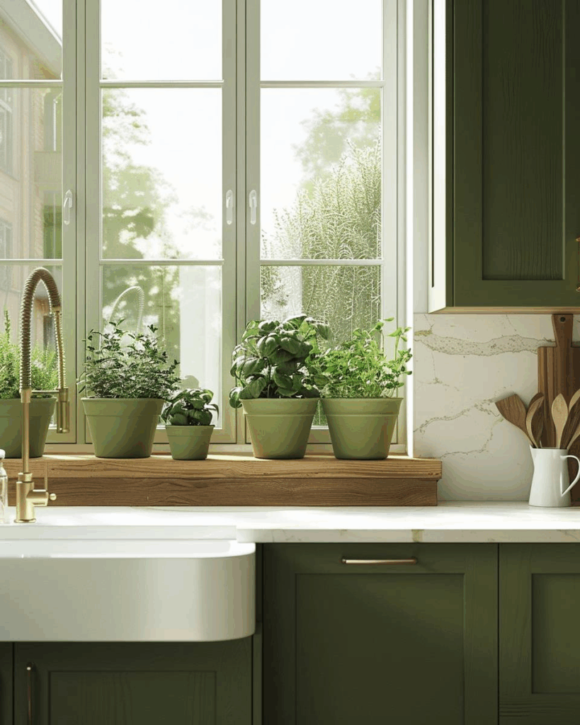 Kräuter in olivgrünen Töpfen geben der Küche Leben. So schaffen wir einen natürlichen Akzent auf der Fensterbank. Frische Kräuter wie Basilikum oder Petersilie sind immer griffbereit. Olivgrün passt zu hellen Arbeitsflächen und Holzdetails.