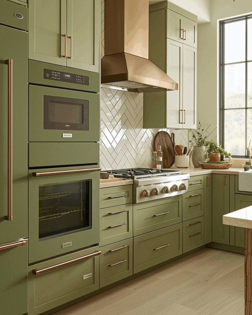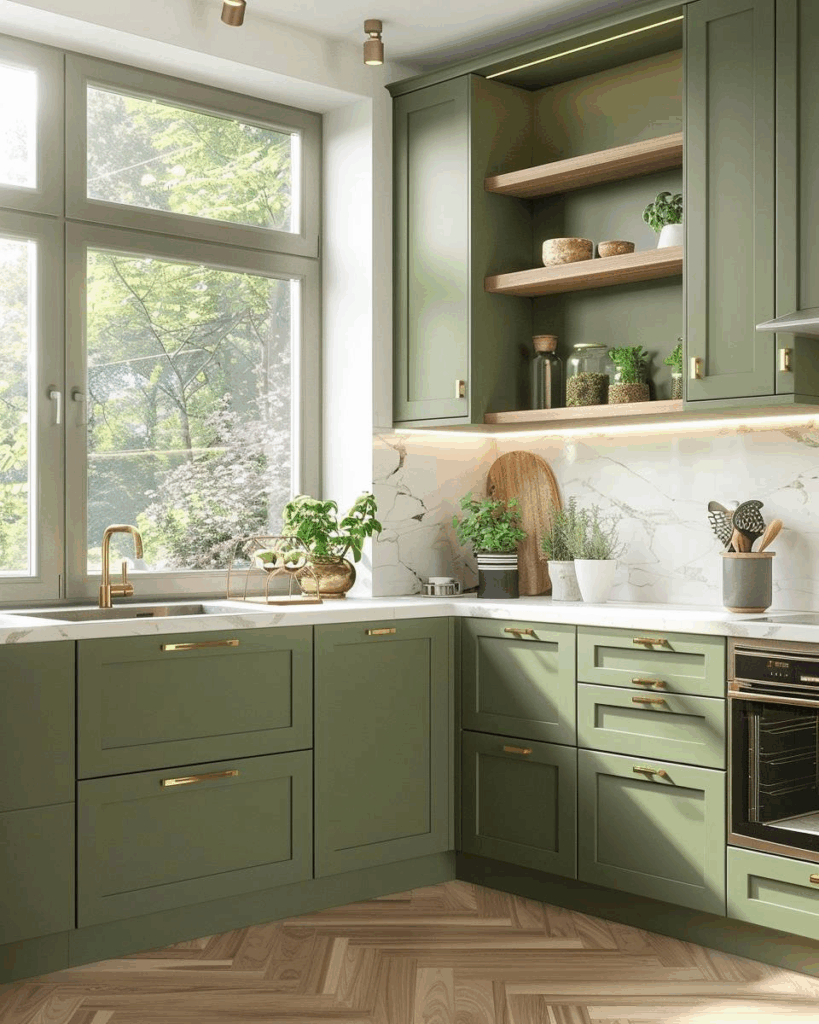 Küche in Olivgrün gestalten- Kombiniere olivgrüne Fronten mit Messinggriffen