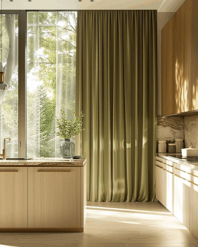 Setze Vorhänge in zartem Oliv vor dein Fenster. Zarter Olivstoff ist luftig und bringt Helligkeit in deine Küche. Wir schaffen so eine freundliche und ruhige Atmosphäre. Kombiniere die Vorhänge mit hellen Möbeln, damit der Raum größer wirkt.