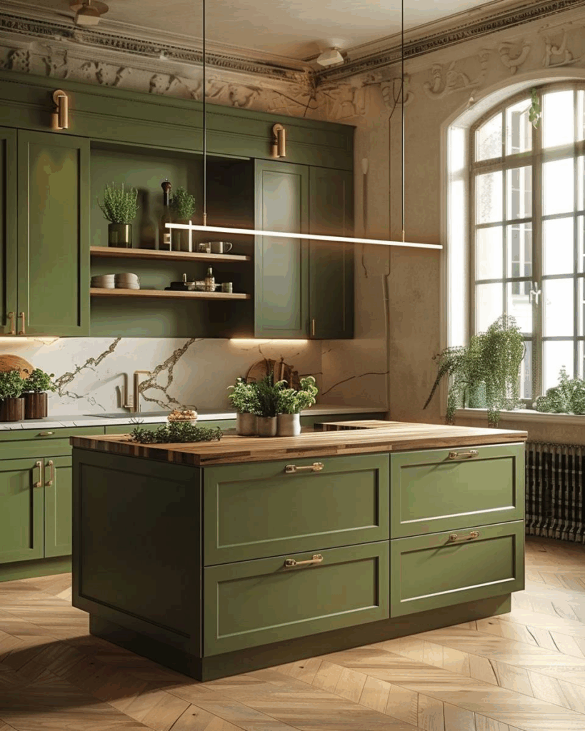 Streiche deine Kücheninsel in tiefem Oliv. Dieser Ton gibt der Insel einen starken Mittelpunkt. Kombiniere dazu Holzgriffe und eine helle Arbeitsplatte. So wirkt die Küche ruhiger und hochwertig. Wände in hellen Farben lassen das Oliv besonders gut zur Geltung kommen.