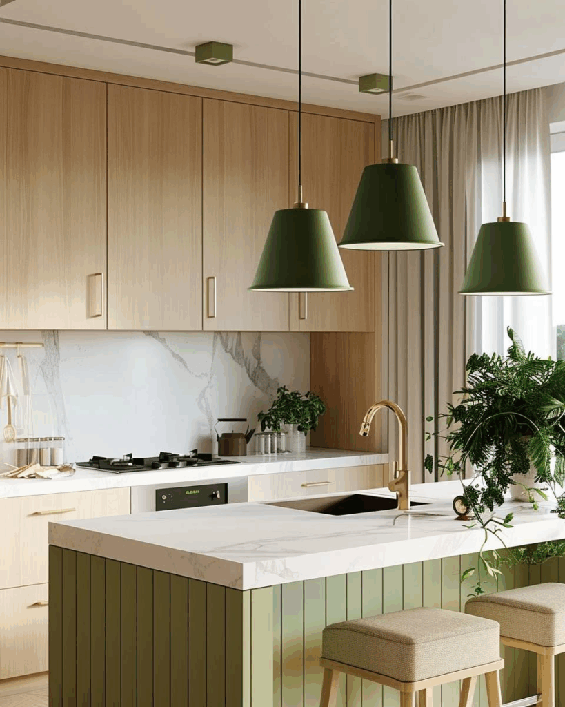 Setze auf olivgrüne Lampenschirme, um der Küche einen modernen Akzent zu geben. Diese Farbe wirkt harmonisch zu Holz, Weiß und Grau. Wir wählen bewusst matte oder strukturierte Stoffe, damit das Licht angenehm bleibt. Kleine Pendelleuchten in Olivgrün passen über die Kochinsel oder den Esstisch.