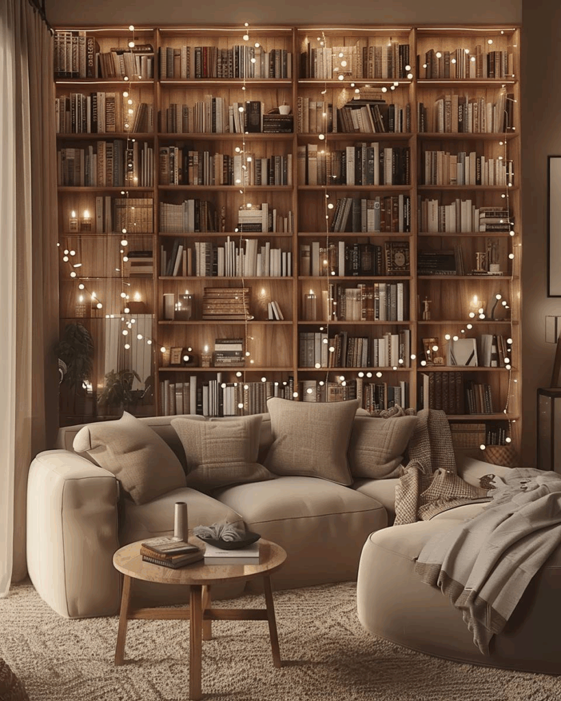 Hänge Lichterketten über deine Bücherregale. Lichterketten geben softes Licht und schaffen direkt eine gemütliche Atmosphäre. Wir legen Kabel lose über die obere Regalreihe, so wirkt das Licht, als würde es schweben. Mit Plug-in-Lichterketten bleibt es flexibel, und du kannst die Deko schnell ändern.