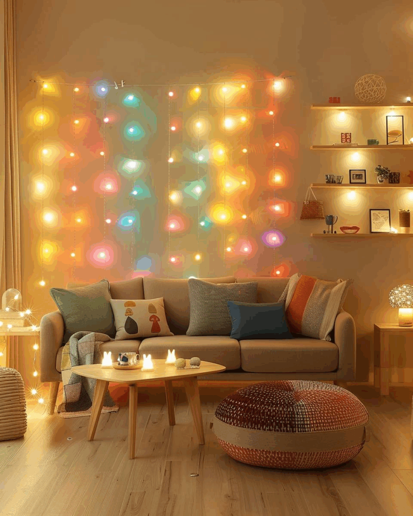 Setze bunte Lichterketten bewusst für leuchtende Akzente im Wohnzimmer ein. Wir platzieren sie gezielt an Regalen, Wänden oder Pflanzen. So grenzen wir verschiedene Bereiche klar ab. Farbtöne wie Blau, Rot und Gelb bringen sofort mehr Stimmung ins Zimmer.