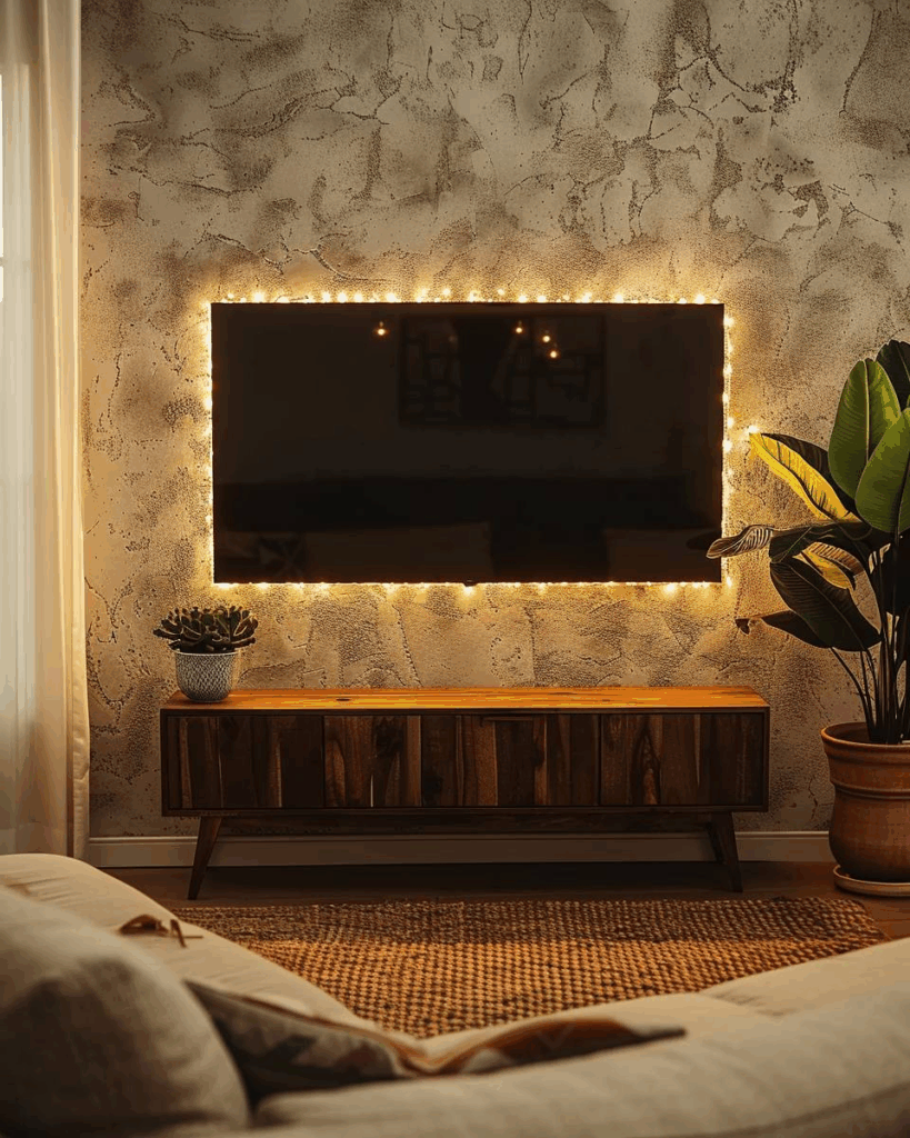 Lege eine Lichterkette rund um deinen Spiegel im Wohnzimmer. Ziehe das Kabel eng am Rahmen entlang. Achte auf gleichmäßige Abstände und sichere lose Enden mit kleinen Klebestreifen. Wähle warmweiße LEDs für ein gemütliches Licht.
