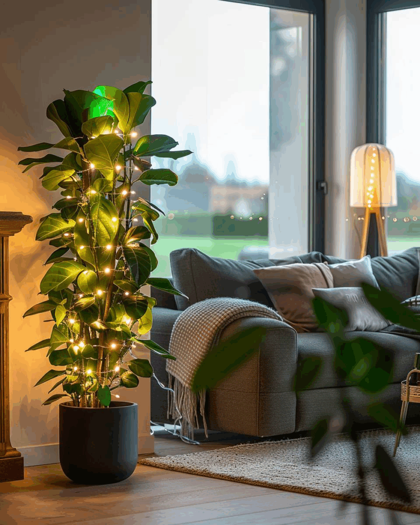 Setze warme Lichterketten direkt auf große Zimmerpflanzen oder hänge sie locker zwischen die Äste. Du bringst mit dem Licht Gemütlichkeit und schaffst einen starken Blickfang im Wohnzimmer. Wichtig: Wir achten darauf, dass die Lichterkette nicht zu heiß wird und die Pflanzen unbeschädigt bleiben. LED-Lichter sind dafür ideal, weil sie wenig Hitze erzeugen.