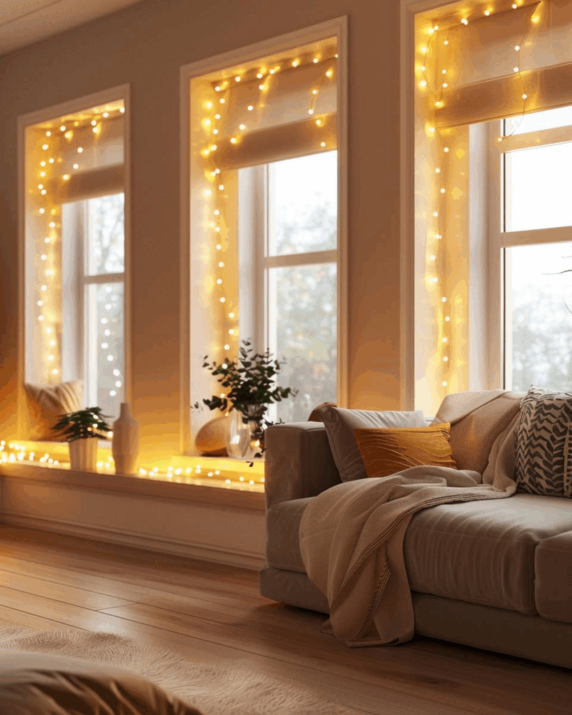 Lege Lichterketten locker auf die Fensterbank. Die schlichte Anordnung sorgt abends für indirektes, warmes Licht im Raum. Wähle batteriebetriebene Modelle, damit du kein störendes Kabel siehst und flexible Lichtakzente setzen kannst.