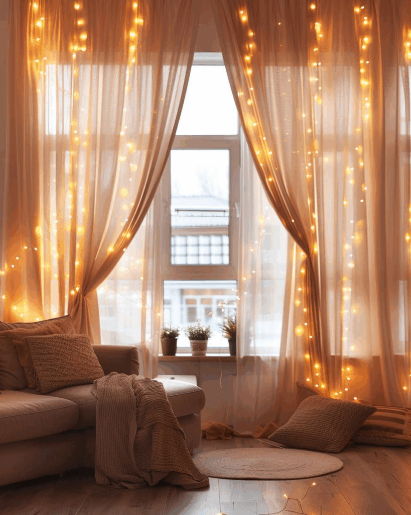 Arrangiere Lichterketten zwischen Vorhang und Fensterscheibe