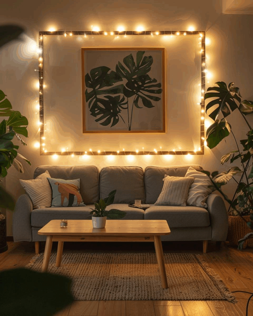 Flechte Lichterketten direkt um Wandbilder, Holzregale oder Makramé. Wir bringen die Kabel hinter den Dekoelementen an. Die Lichter heben Konturen hervor und lassen Motive stärker wirken. So schaffen wir einen echten Hingucker im Wohnzimmer.