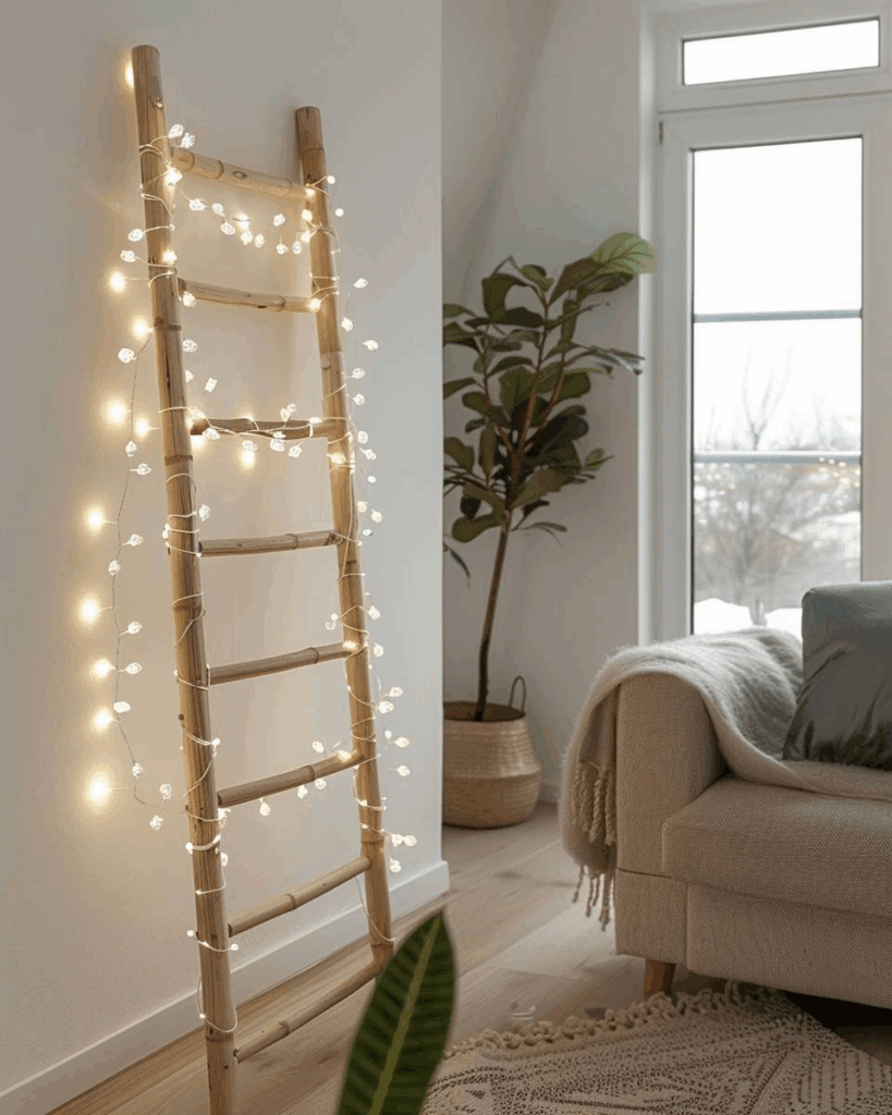 Wickle Lichterketten um eine hölzerne Leiter als Hingucker