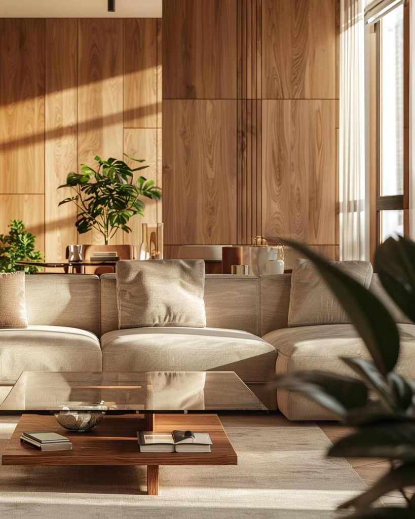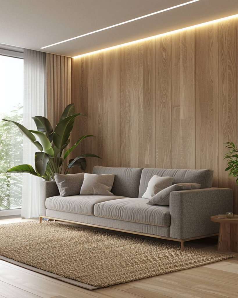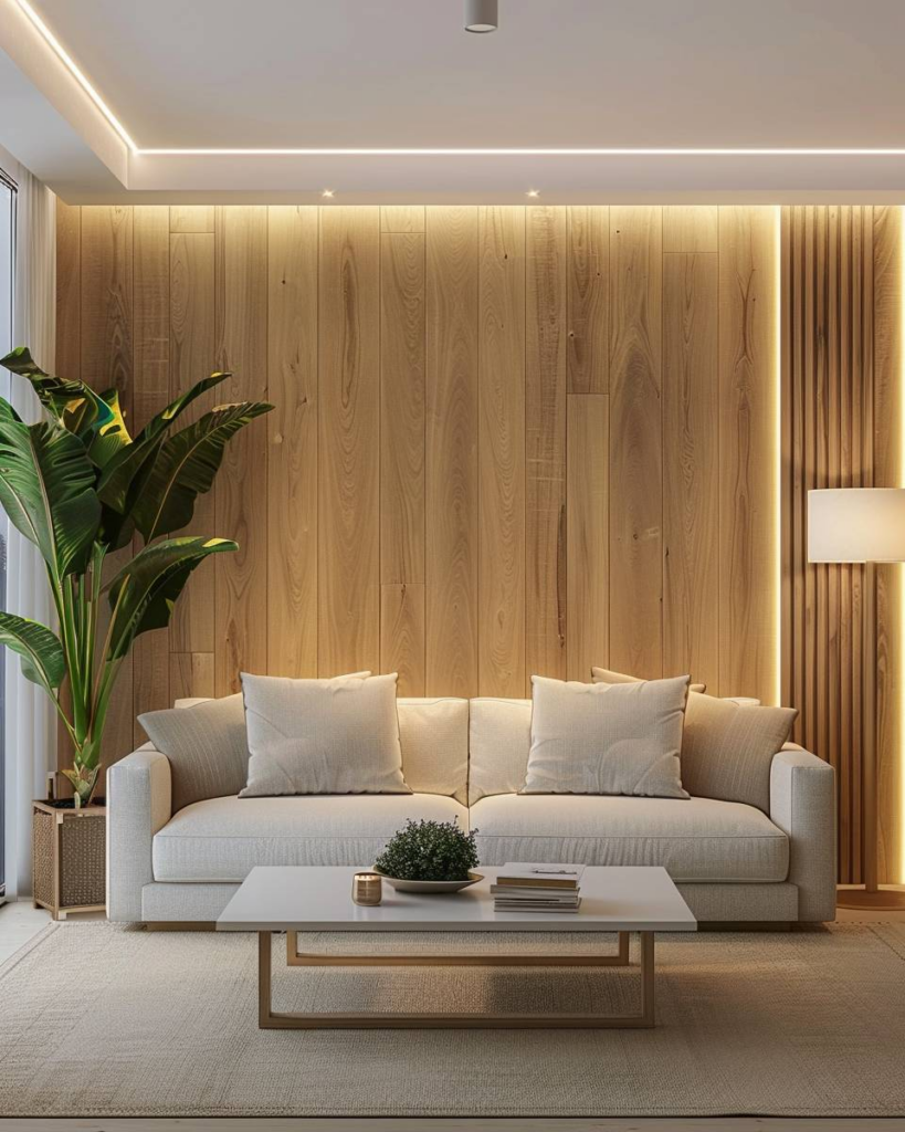 Setze auf schlichte Holzwandverkleidungen im Wohnzimmer