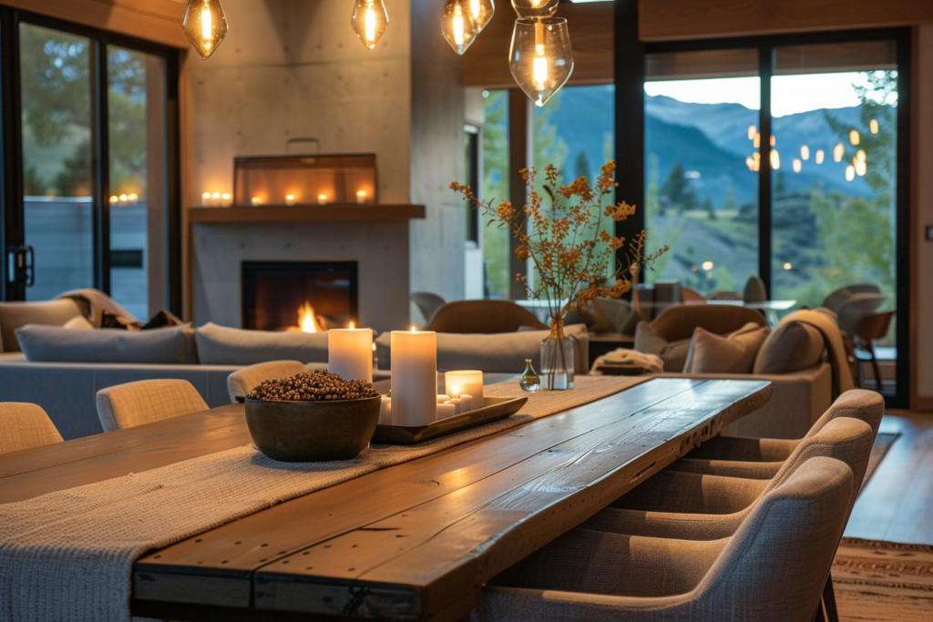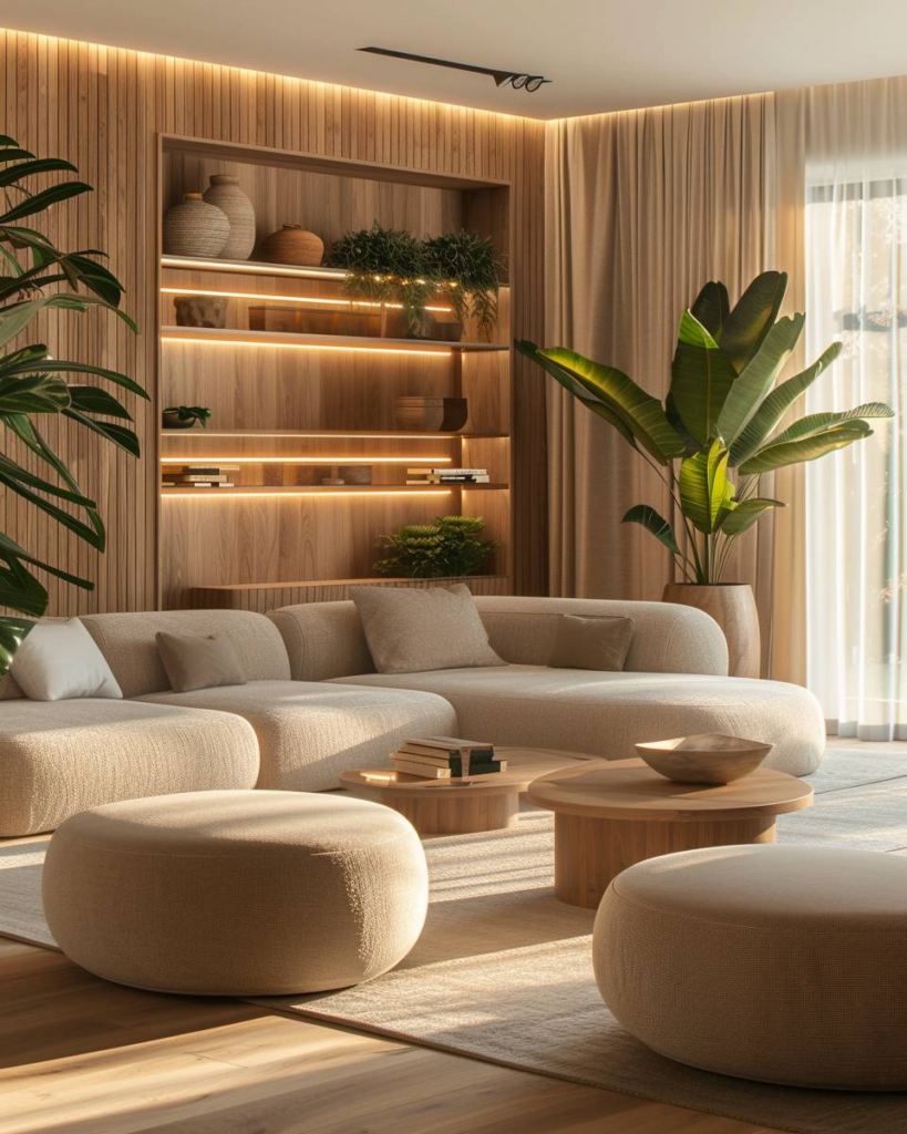 Schaffe mit warmen Holzfarben Gemütlichkeit. Helles Eichenholz lässt Räume offen wirken. Dunkles Nussbaumholz bringt Tiefe und Geborgenheit. Weiche Stoffe wie Wolle und Kissen sorgen für Behaglichkeit. Kombiniere sanftes Licht, um die Holztöne zu betonen.