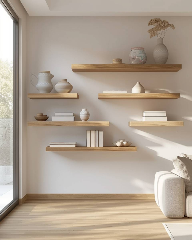 Integriere filigrane Holzregale für Leichtigkeit
