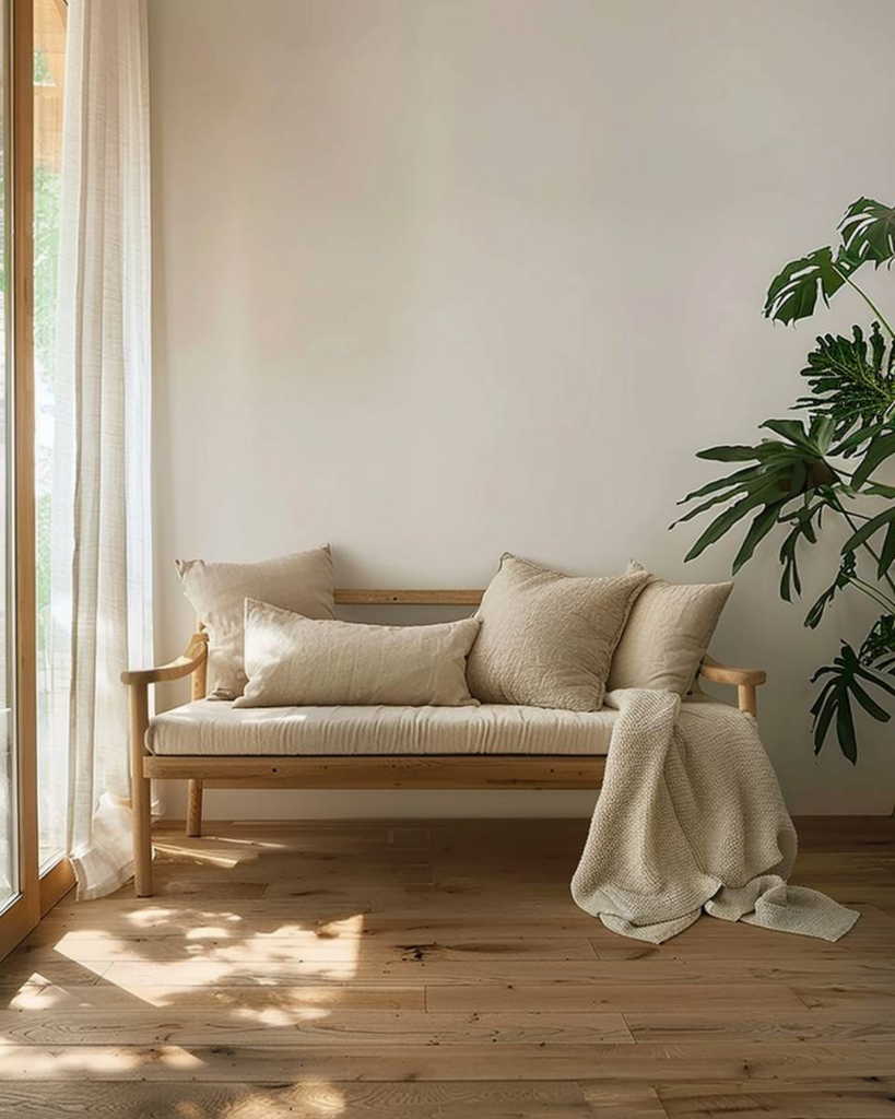 Erschaffe Wohlfühlecken mit Holzbank und Kissen