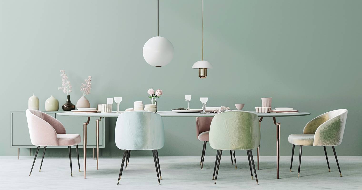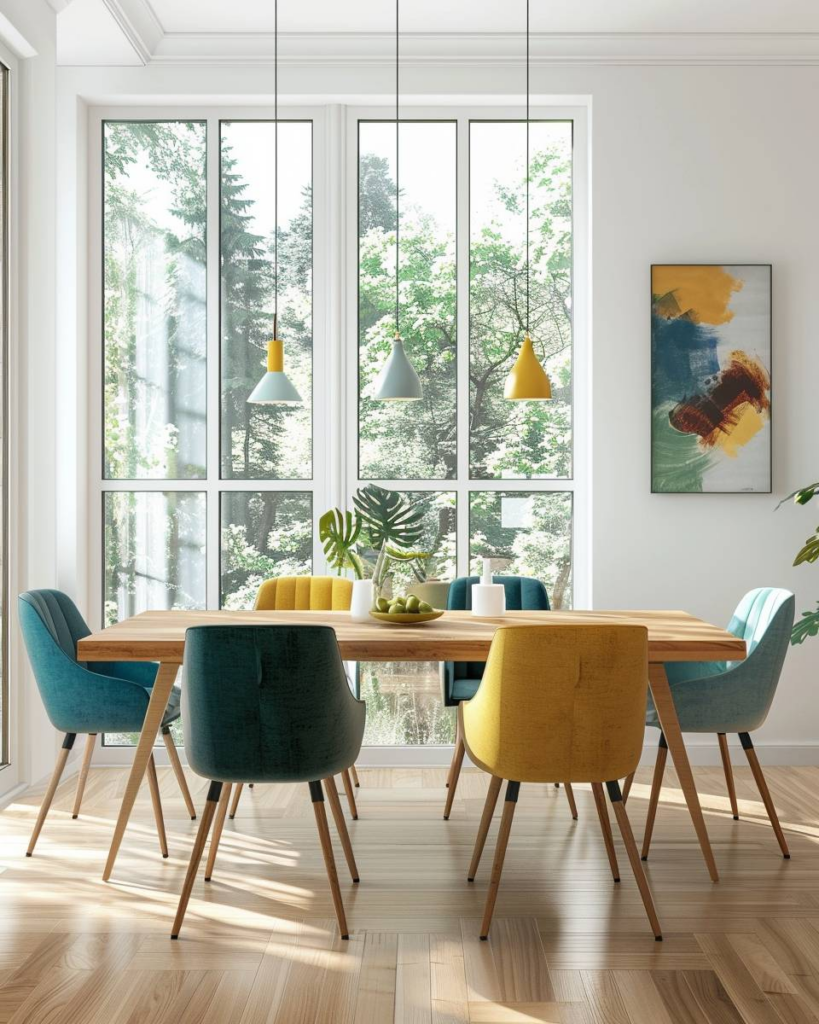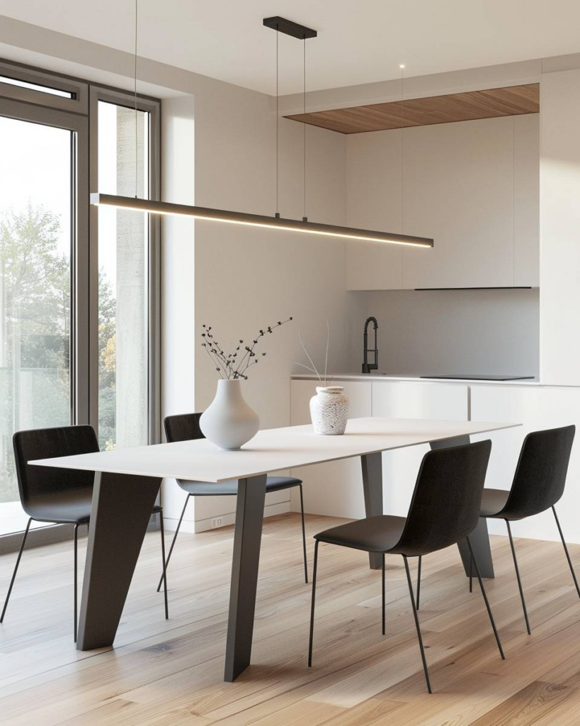 Minimalistische Esstische mit klaren Linien, farbige Akzente durch Stuhlbezüge und ein Statement-Pendellicht über dem Tisch sind starke Ideen für einen modernen Stil.