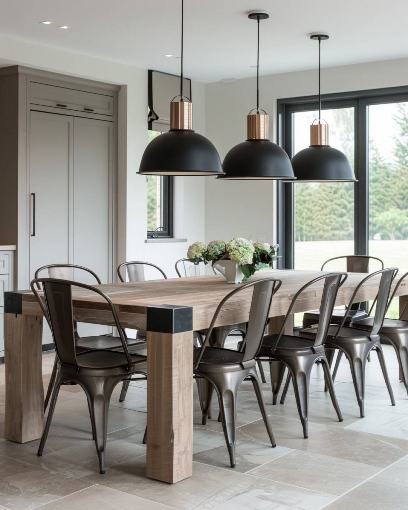 Wir kombinieren Holz und Metall für starke Kontraste im Esszimmer. Holz gibt Wärme und eine natürliche Atmosphäre. Metall setzt klare Akzente und wirkt modern. Zusammen schaffen wir ein stilvolles und spannendes Gesamtbild.