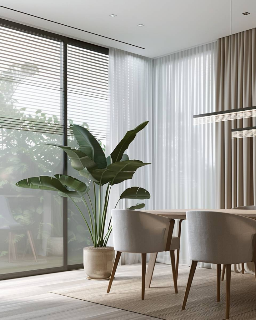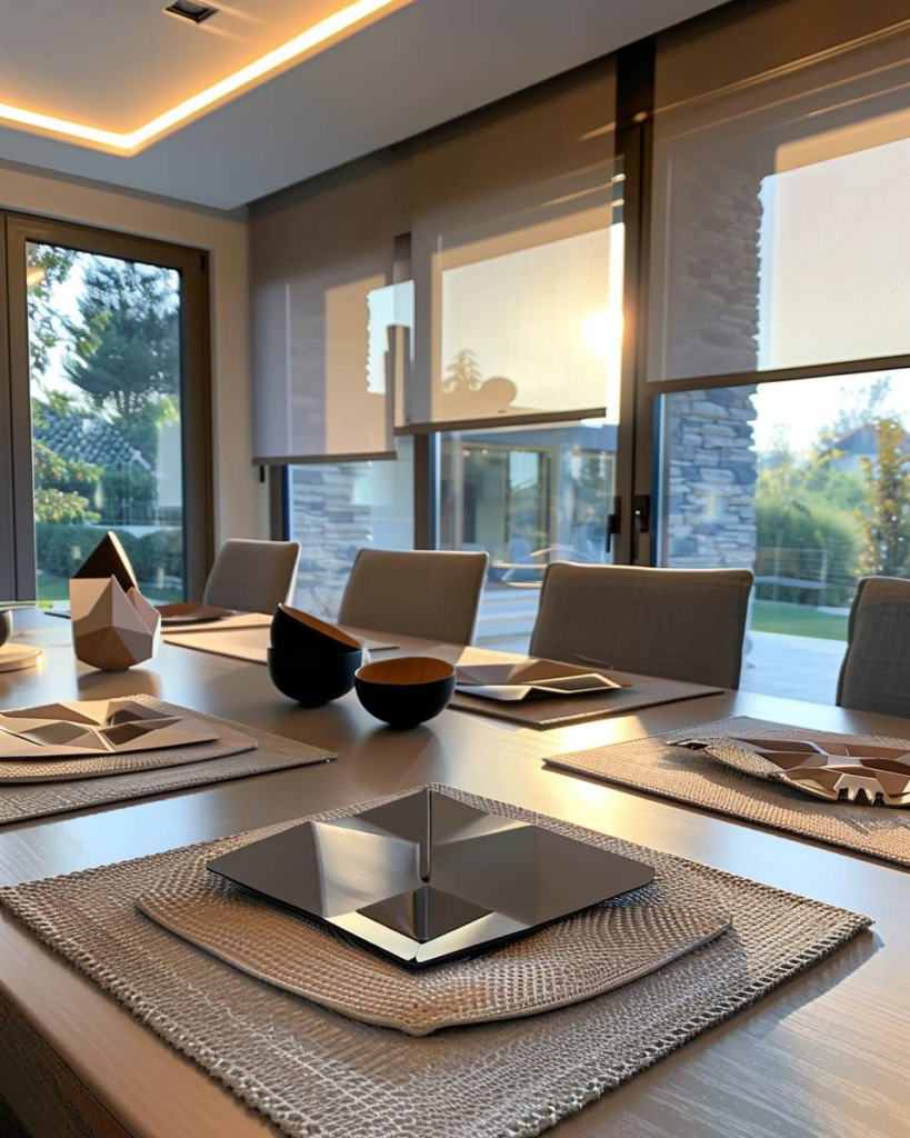 Setze deine Fenster mit modernen Vorhängen oder Jalousien in Szene. Stoff und Farbe bestimmen, ob dein Esszimmer warm oder sachlich wirkt. Wir wählen immer leichte Stoffe, wenn wir mehr Licht wünschen, und dichte Jalousien für Sichtschutz. Farbtöne wie Grau, Weiß oder sanfte Erdtöne passen zu vielen Möbeln.