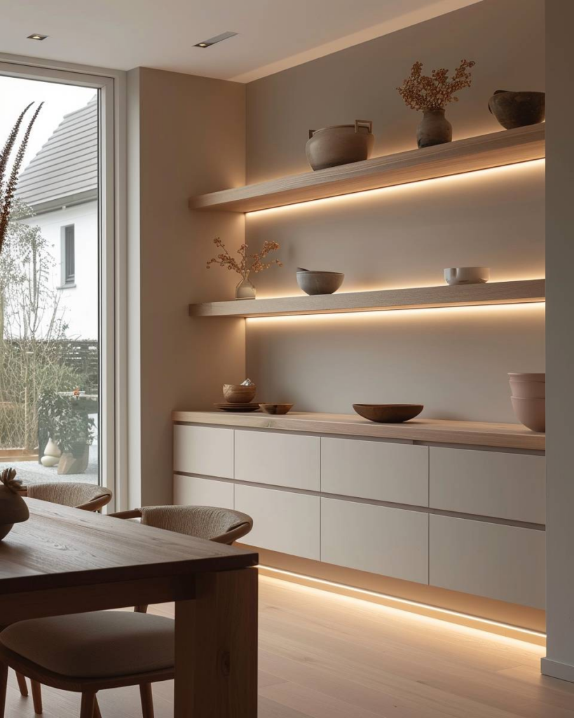 Teile den Essbereich mit offenen Regalen und platziere darin Deko, Bücher oder Pflanzen. So bringen wir Struktur in den Raum und schaffen lockere Übergänge zwischen den Zonen. Das Regal trennt, ohne Licht zu nehmen, und wirkt modern.