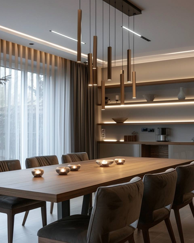 Bringe ein Pendellicht direkt über dem Esstisch an. Die Lampe ist der Mittelpunkt für Gespräche und Atmosphäre. Wähle ein Design, das zur Form und Größe deines Tisches passt. Stelle sicher, dass das Licht dimmbar ist und blendfreies Licht gibt.