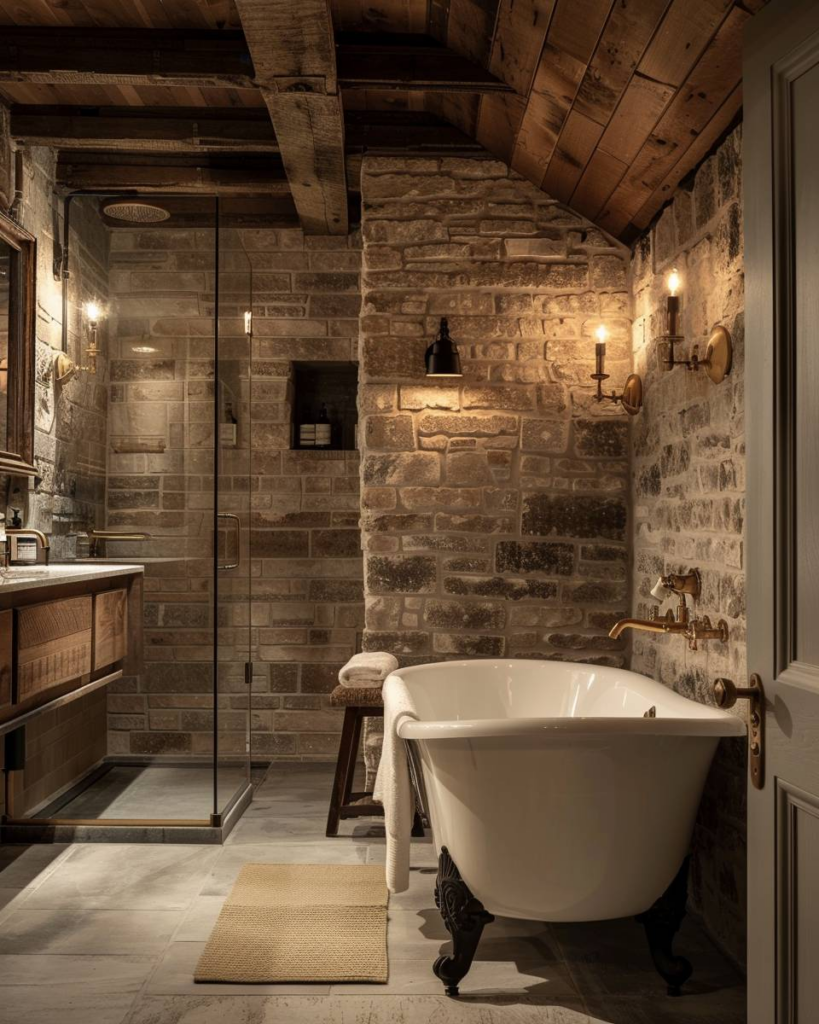 Setze Armaturen, Seifenspender und Lampen in Bronze oder Kupfer ein. Diese Farbtöne wärmen Holz, Naturstein und schlichte Fliesen sofort auf. Wähle schlichte Formen ohne Schnörkel. So schaffen wir ein authentisches, modernes rustikales Badezimmer.