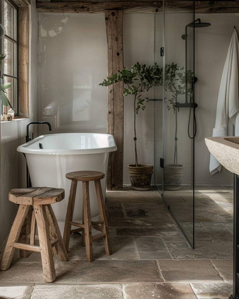 Du gestaltest deinen Raum spannend durch recyceltes Holz für Waschtische, Vintage-Badewannen und Natursteinfliesen.