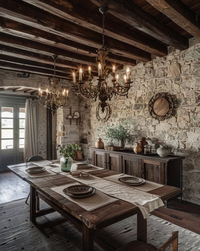 Setze Naturstein als Wandakzent ein, um deinem Esszimmer Struktur zu geben. Steinwand ist langlebig und leicht zu reinigen. Leuchtende Farben und warme Holzmöbel passen gut dazu. Wir verbinden so rustikales Flair mit moderner Gemütlichkeit. Sorge dafür, dass Beleuchtung die Steinstruktur gut hervorhebt.