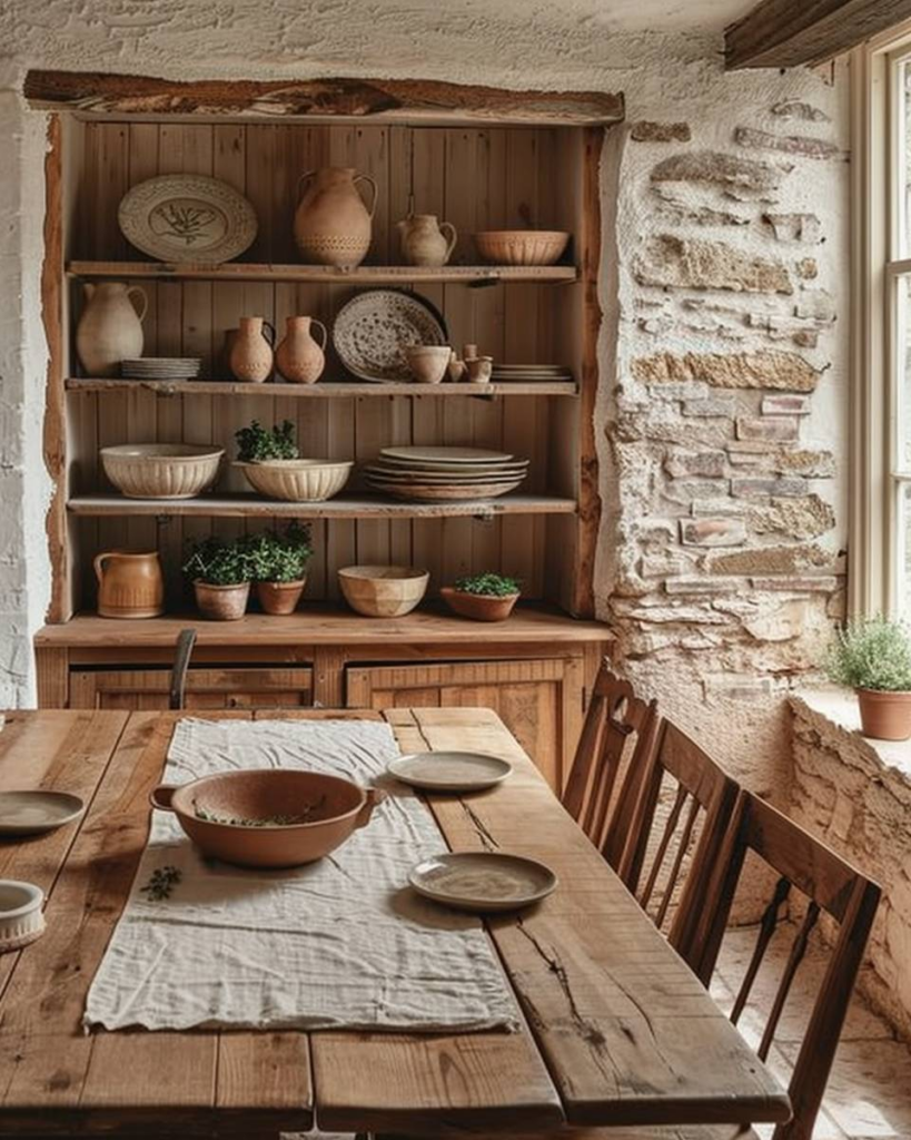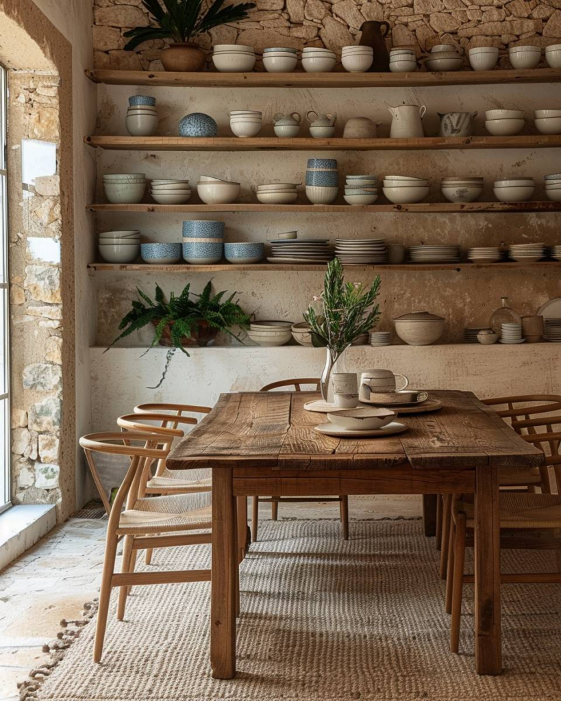 Stelle Keramik und Tonwaren wie Tassen, Schalen oder Karaffen offen auf Regalen oder Sideboards aus. Wir setzen sie gezielt als Deko ein und mischen verschiedene Größen und Farben. So bringst du Handarbeit und Struktur ins Esszimmer und gibst dem Raum eine warme Ausstrahlung.