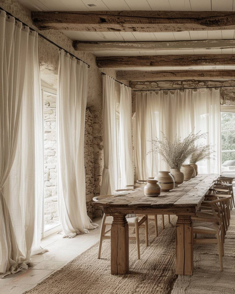 Verhülle Fenster mit Leinenvorhängen, um dem Raum Struktur und Natürlichkeit zu geben. Leinen schafft ein sanftes Licht und hält den Blick nach draußen frei. Wir wählen Vorhänge in warmen Naturtönen. Damit wirkt dein Esszimmer ruhig und wohnlich.