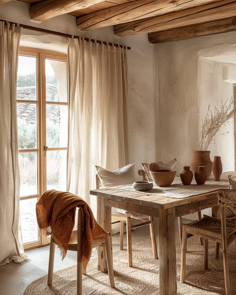 Verhülle Fenster mit Leinenvorhängen, um dem Raum Struktur und Natürlichkeit zu geben. Leinen schafft ein sanftes Licht und hält den Blick nach draußen frei. Wir wählen Vorhänge in warmen Naturtönen. Damit wirkt dein Esszimmer ruhig und wohnlich.