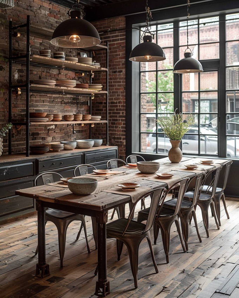 Nutze starke Eisenlampen, schlichte Regale aus Rohren und eiserne Stühle. Eisen sorgt für einen coolen, robusten Look im Esszimmer. Kombiniere Massivholz mit Eisendetails, damit du Gemütlichkeit und industriellen Stil schaffst.