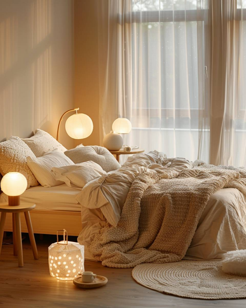 Kuschelige Wolldecken in Erdtönen, sanfte Lichtquellen mit warmen Lampen und schlichte Vorhänge aus Leinenstoff bringen dir Wärme, Geborgenheit und skandinavische Natürlichkeit beim Einrichten.