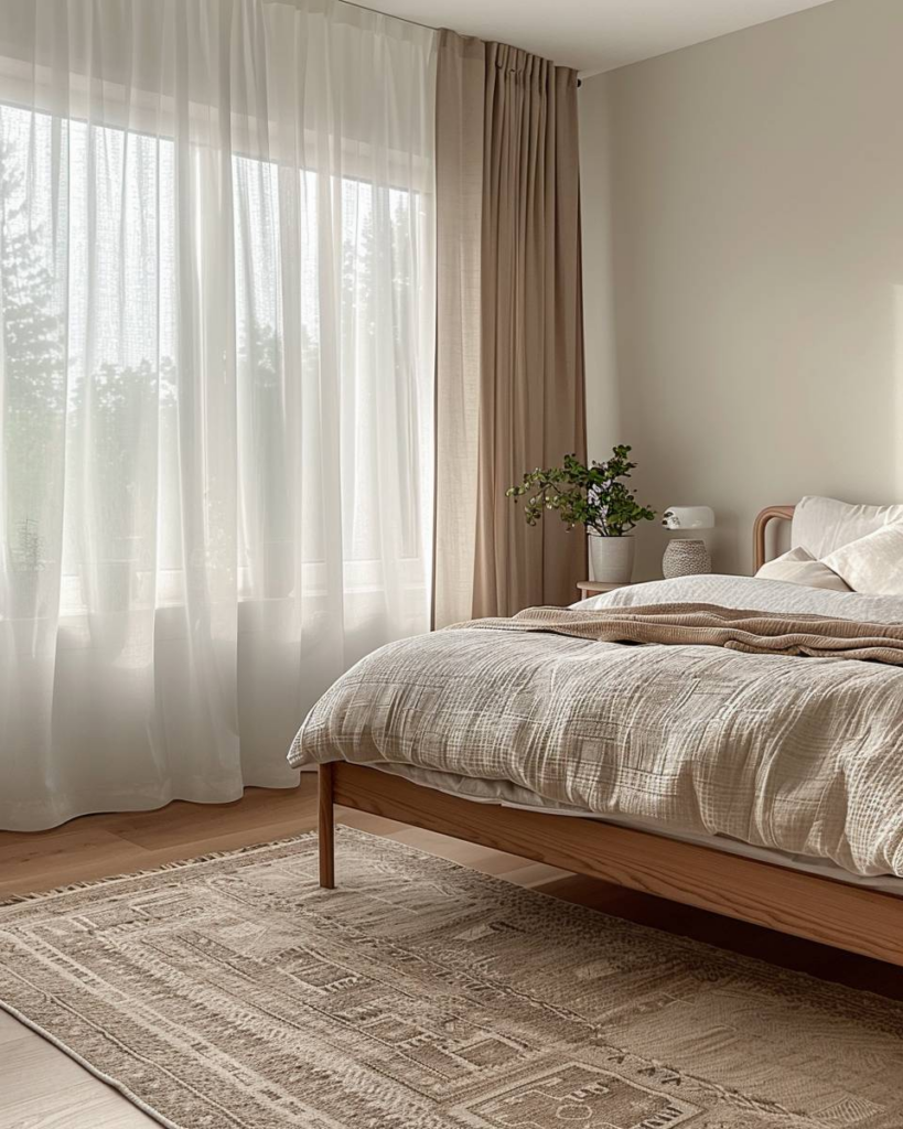 Wähle schlichte Leinenvorhänge, weil sie das Tageslicht weich filtern und Ruhe schaffen. Leinen ist leicht, pflegeleicht und sieht natürlich aus. Wir hängen die Vorhänge bodenlang auf, damit das Fenster elegant wirkt. Die natürliche Farbe von Leinen sorgt für eine entspannte Atmosphäre.