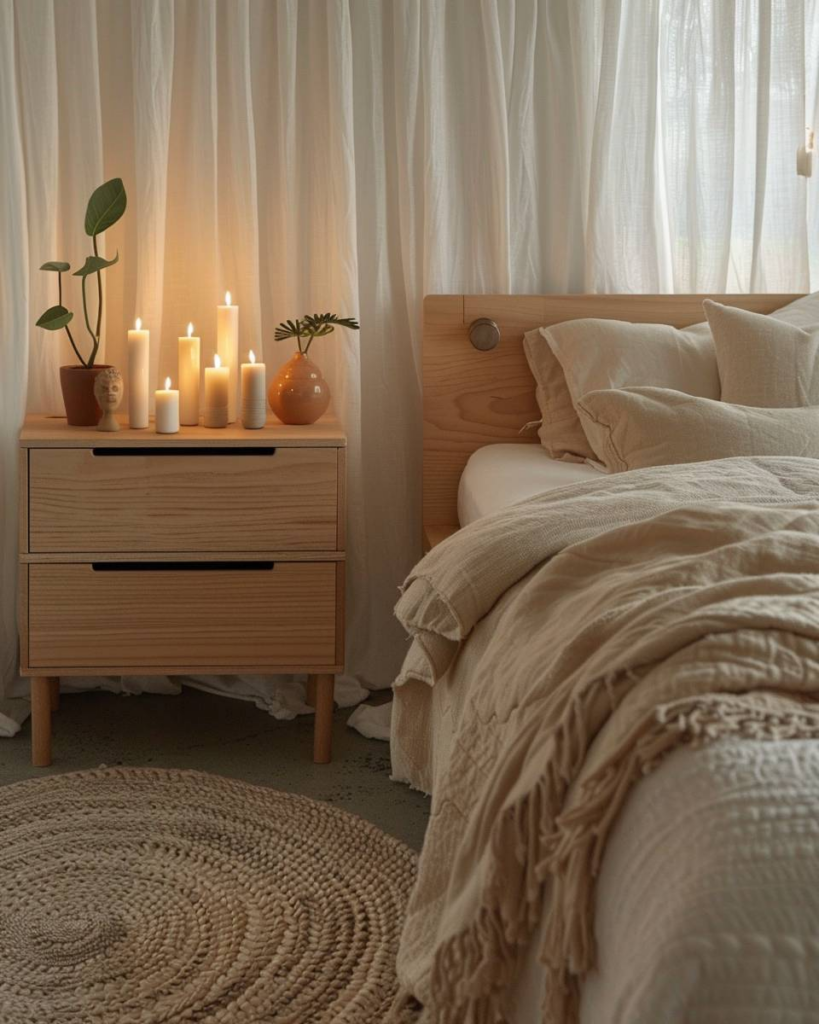 Stelle handgemachte Kerzen auf deine Nachttische oder Fensterbänke. Naturwachs sorgt für warmes, sanftes Licht im Schlafzimmer. Wir vermeiden elektrische Lichtquellen, weil Kerzenschein Ruhe und Gemütlichkeit bringt. Platziere Kerzenhalter so, dass du dich sicher fühlst.
