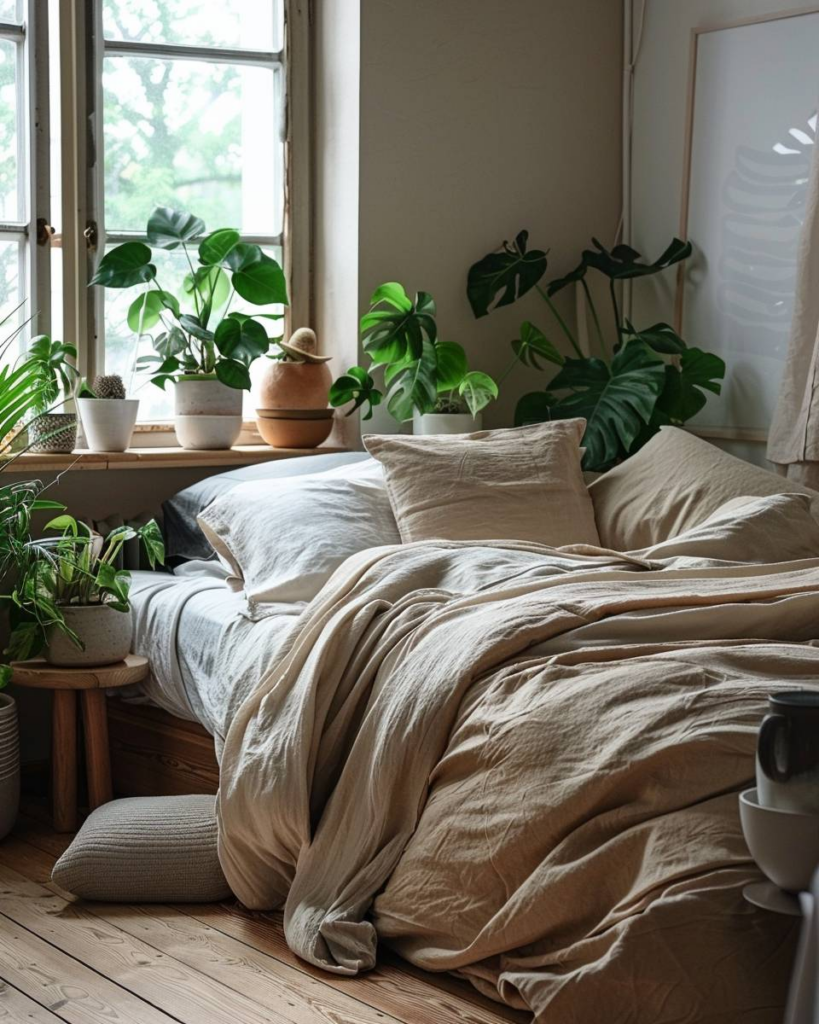 Stell ein paar grüne Pflanzen auf. Zimmerpflanzen wie Bogenhanf oder Efeutute sind pflegeleicht und filtern Schadstoffe aus der Luft. Sie verbessern das Raumklima und sorgen für mehr Frische im Schlafzimmer.