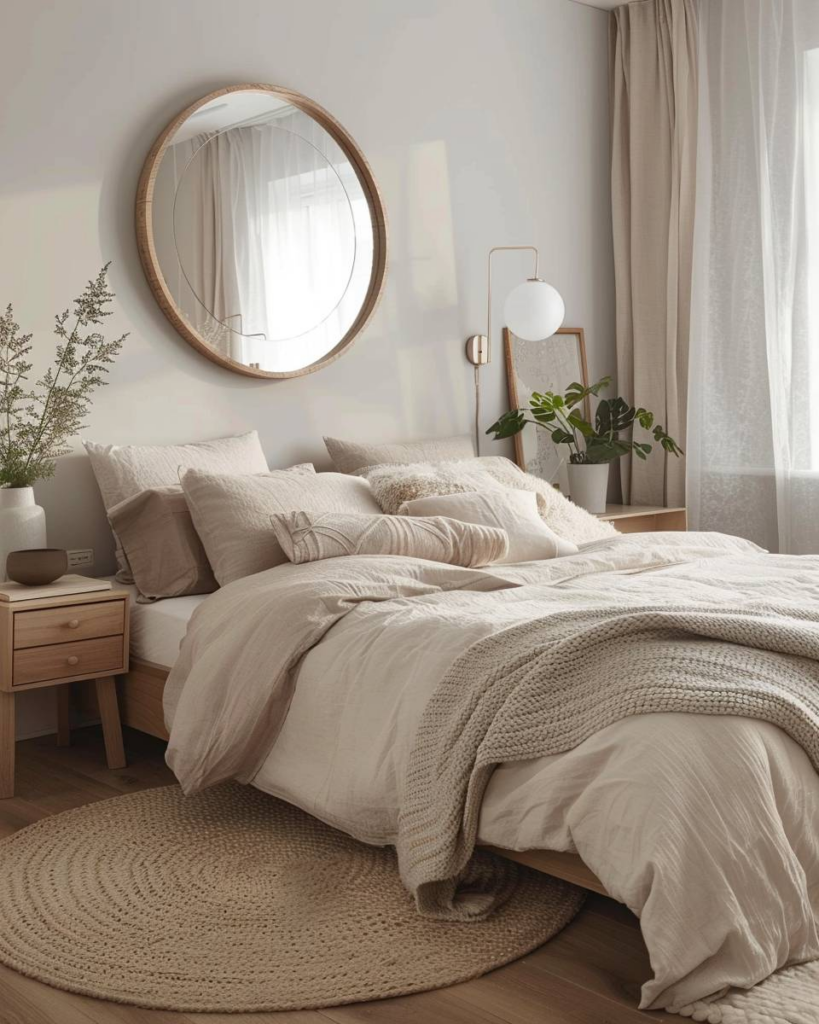 Vergrößere dein Schlafzimmer mit einem großen Spiegel. Hänge den Spiegel gegenüber vom Fenster auf. Er fängt das natürliche Licht ein und verteilt es im Raum. So wirkt das Zimmer heller und offener. Dein Hygge-Schlafzimmer fühlt sich sofort entspannter an.