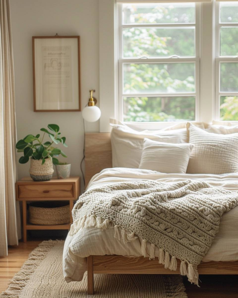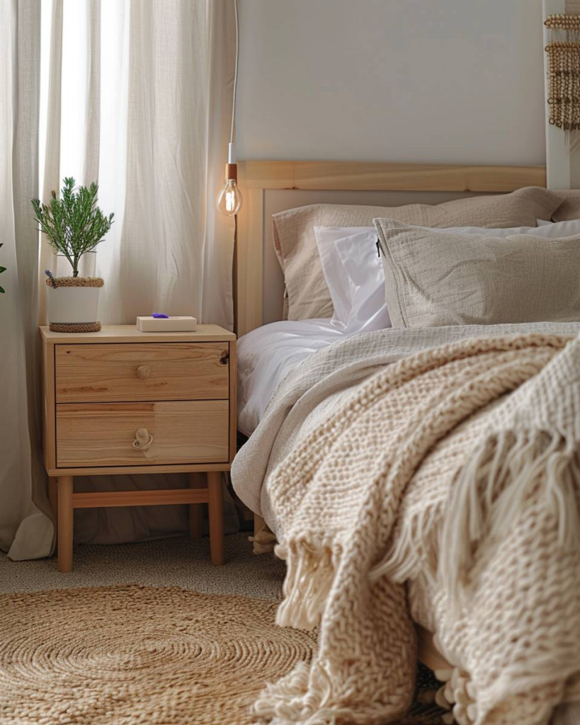 Lege eine Tagesdecke mit grober Strickstruktur auf dein Bett. Die Decke bringt Textur und warme Gemütlichkeit ins Schlafzimmer. Wir setzen damit einen starken Akzent und machen das Bett zum Hingucker im Hygge-Stil. Wähle helle Naturtöne, damit alles ruhig und einladend wirkt.