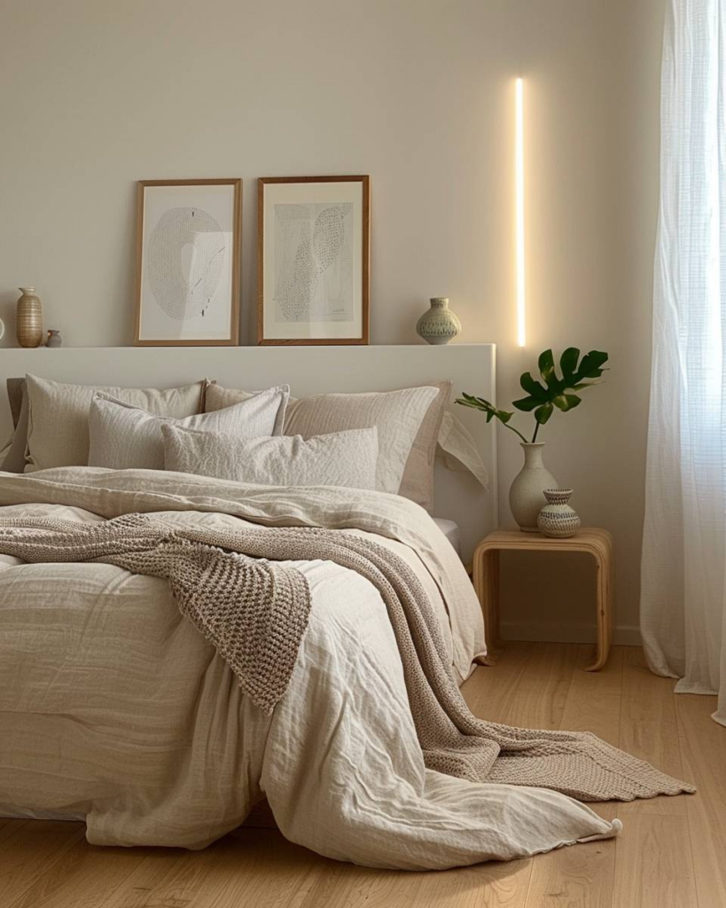 Wähle schlichte Bilder oder dezente Poster für deine Wand. Wir hängen sparsam auf und lassen viel Raum. Kleine Holzrahmen oder einzelne Pflanzen sind ideal. So wirkt dein Schlafzimmer ruhig und einladend.