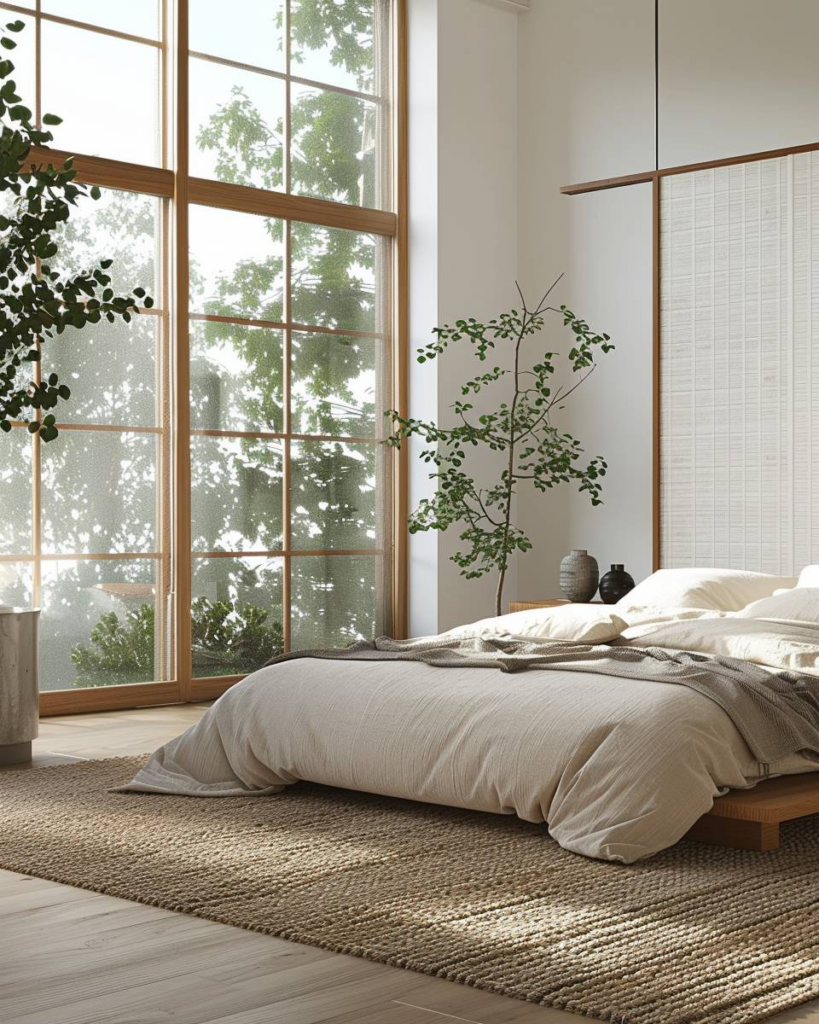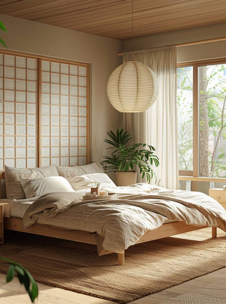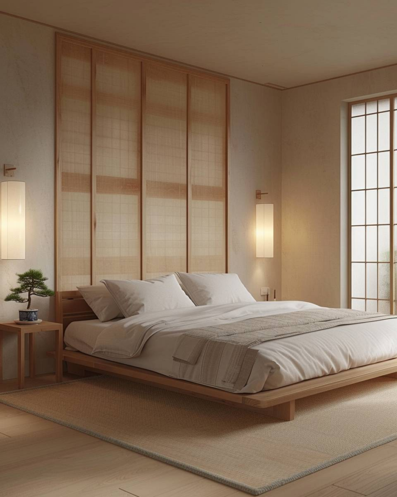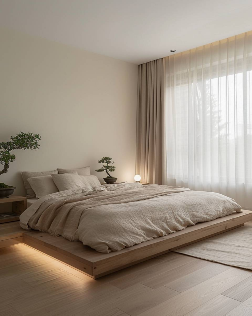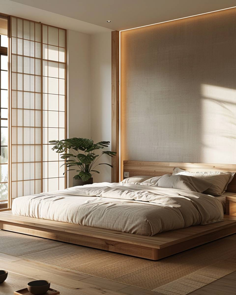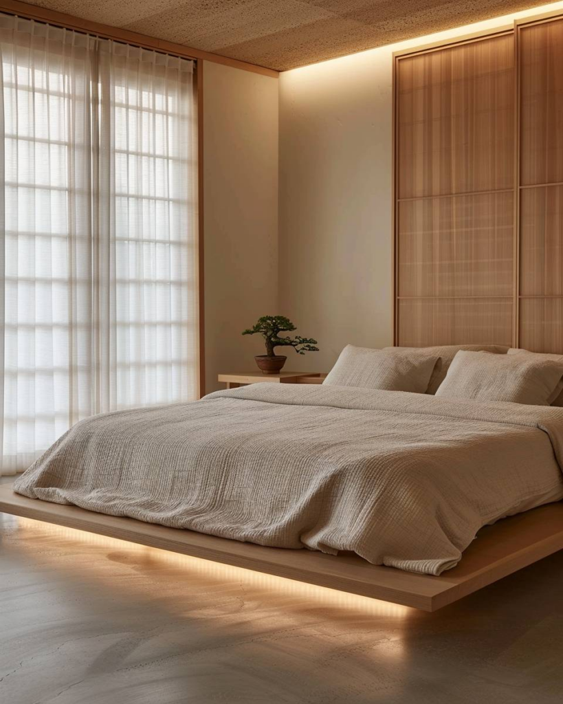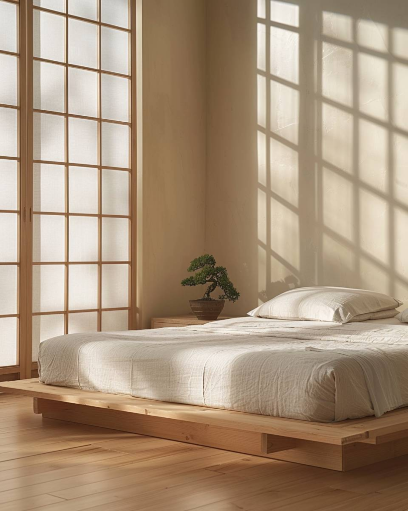 Lege das Bett nah am Boden wie in Japan. Ein Futon oder schlichtes Holzgestell bringt Ruhe. Verzichte auf ein Kopfteil. Das Bett steht mitten im Raum und lässt Luft zirkulieren. Wir schaffen damit klare Linien und mehr Platz im Schlafzimmer.