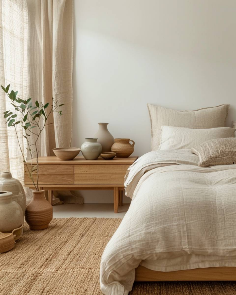 Zeig handgemachte Deko, Keramik oder Möbel direkt im Schlafzimmer. Handgefertigte Einzelstücke bringen Wärme und Charakter in den Japandi-Stil. Wir setzen klare Akzente und sorgen dafür, dass dein Raum besonders wirkt. Diese Stücke verbinden Natürlichkeit mit schlichter Eleganz.