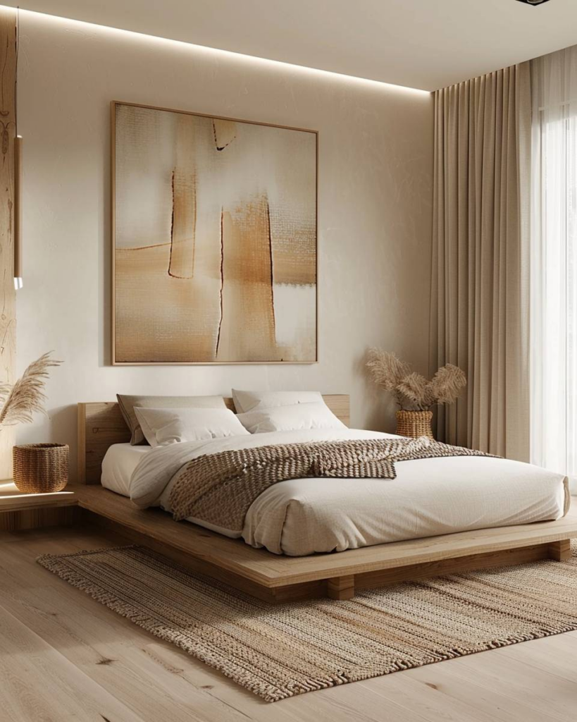 Zeige abstrakte Wandbilder über deinem Bett und wähle klare Linien und ruhige Farben. Diese Motive geben dem Schlafzimmer Ruhe und passen zum Japandi-Stil. Wir hängen sie mit schmalen Holzrahmen auf, damit das Bild bleibt und der Raum ruhig wirkt. Du richtest den Blick gezielt auf das Kunstwerk und bringst Balance in den Raum.