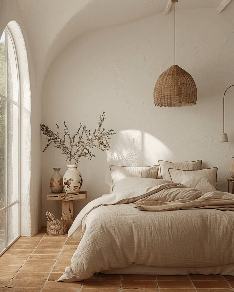 Warme Erdtöne an den Wänden, Leinenbettwäsche und Rattanmöbel helfen dir, dein Schlafzimmer stilvoll und leicht zu gestalten und einzurichten.