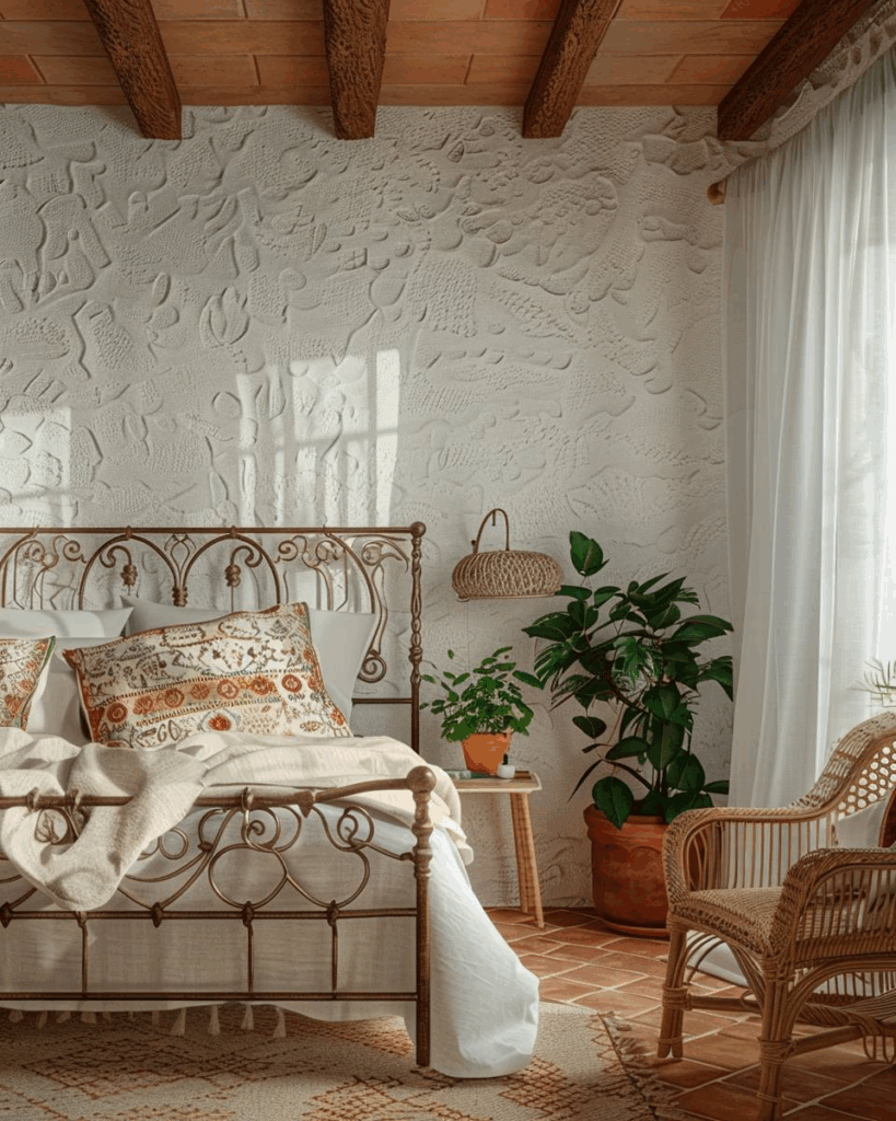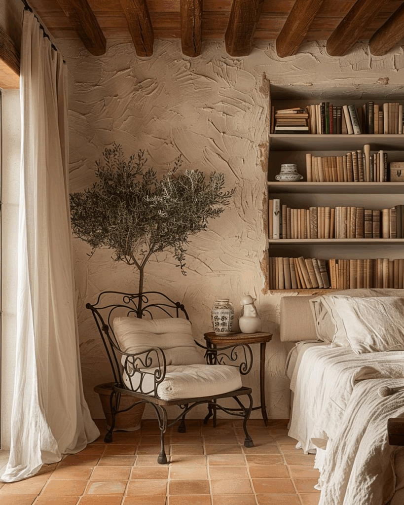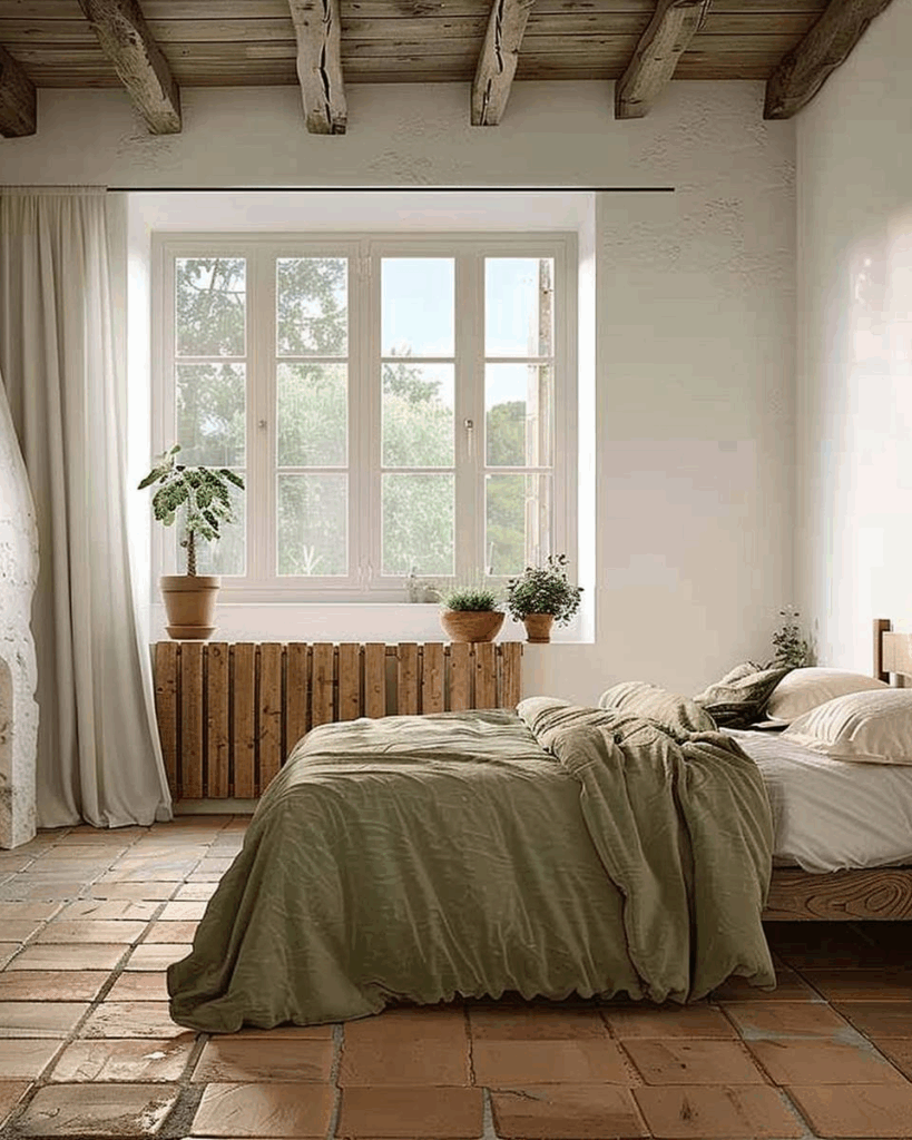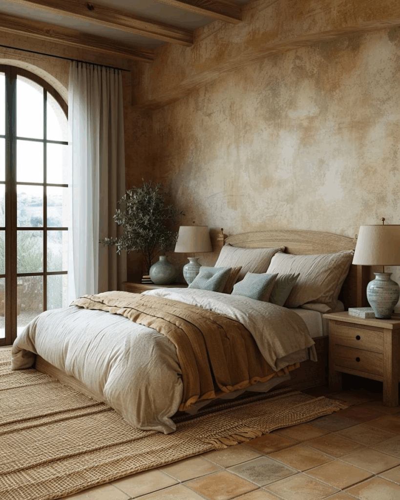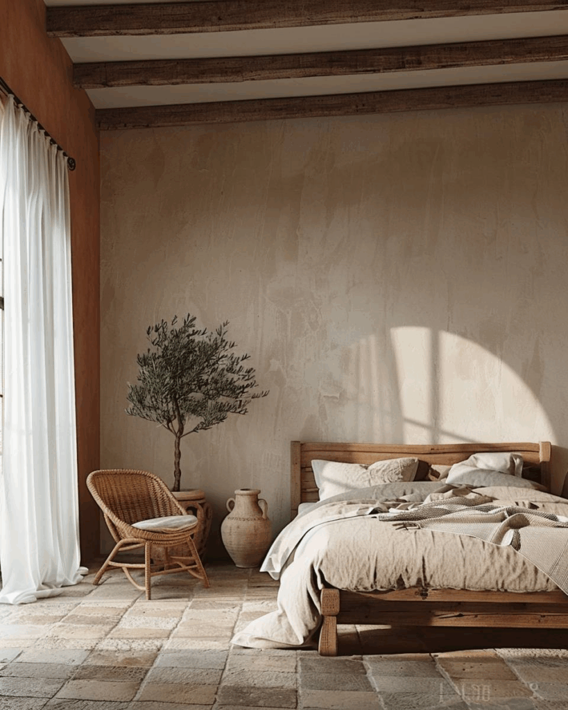 Setze auf warme Erdtöne wie Terrakotta, Ocker oder Sand. Diese Farben bringen Ruhe in dein Schlafzimmer. Sie lassen den Raum freundlich und natürlich wirken. Mit passenden Textilien und Holzmöbeln schaffst du ein stimmiges mediterranes Ambiente.