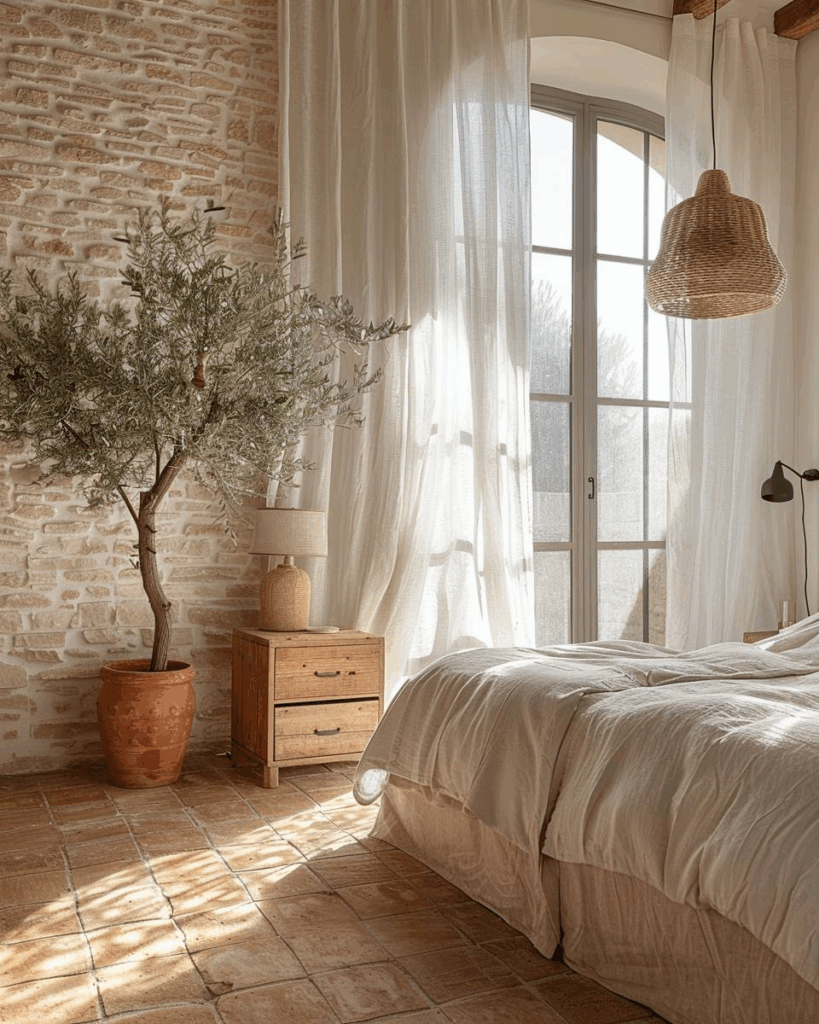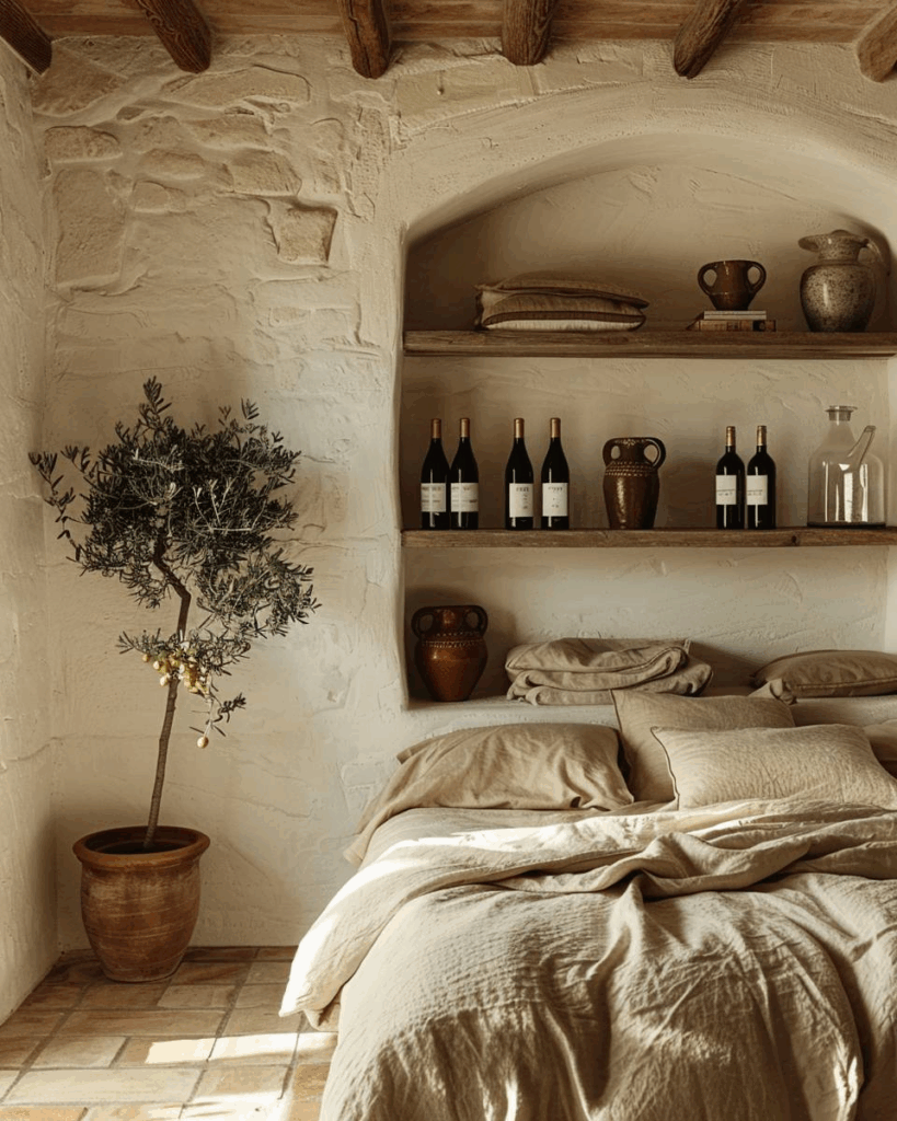 Setze massive Holznachttische neben dein Bett. Naturbelassenes Vollholz ist langlebig und robust. Einfache Formen und sichtbare Maserungen schaffen mediterranes Flair. Dekoriere mit Terrakotta-Vasen oder Leinenlampen, um den Stil zu unterstreichen.