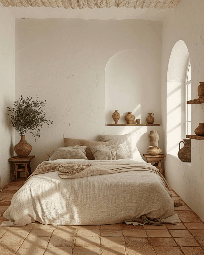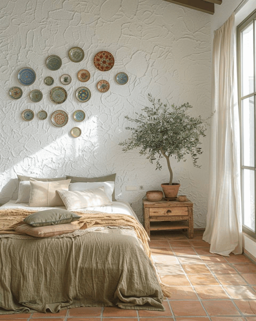 Stelle handgemachte Keramikvasen auf deinen Nachttisch oder dein Fensterbrett. Die Keramikvasen bringen natürliche Strukturen und erdige Farben ins Schlafzimmer. Fülle sie mit Lavendel oder Olivenzweigen. So verstärkst du das mediterrane Flair und bleibst bei echten Materialien.