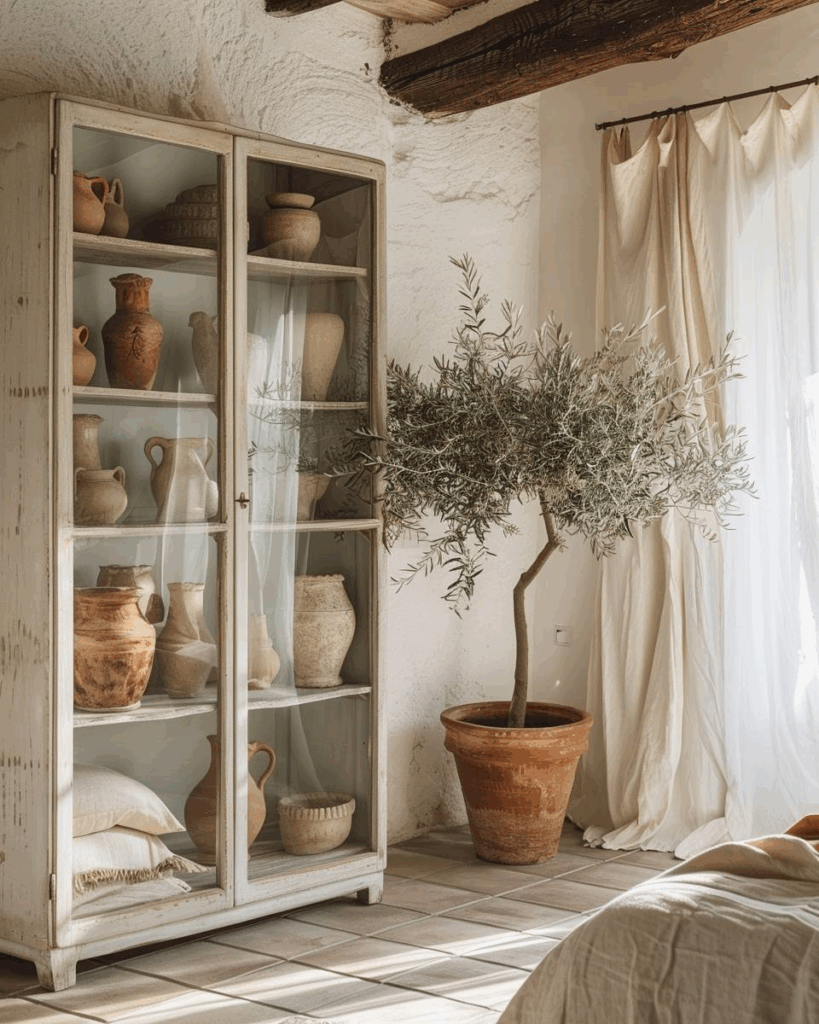 Zeig Besonderes in einer Vitrine im Schlafzimmer. Eine Glasvitrine bringt handgefertigte Deko, Keramik oder Souvenirs aus dem Urlaub gut zur Geltung. Farben wie Terrakotta und Sand passen immer zu einem mediterranen Stil. Wir setzen eine Vitrine gezielt als Hingucker ein und ordnen alles klar an. Du sorgst so für mehr Leichtigkeit und bleibst immer ordentlich.