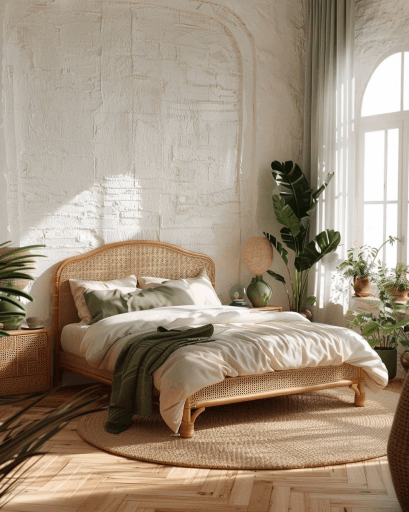 Setze Rattanmöbel im Schlafzimmer ein, um natürliche Wärme und Struktur zu schaffen. Das Material ist robust und bringt mediterranes Flair direkt zu dir. Rattan harmoniert mit Holz, Leinen und hellen Wänden. Wir wählen dazu Bettgestelle, Nachttische oder Körbe aus Rattan für ein stimmiges Gesamtbild.