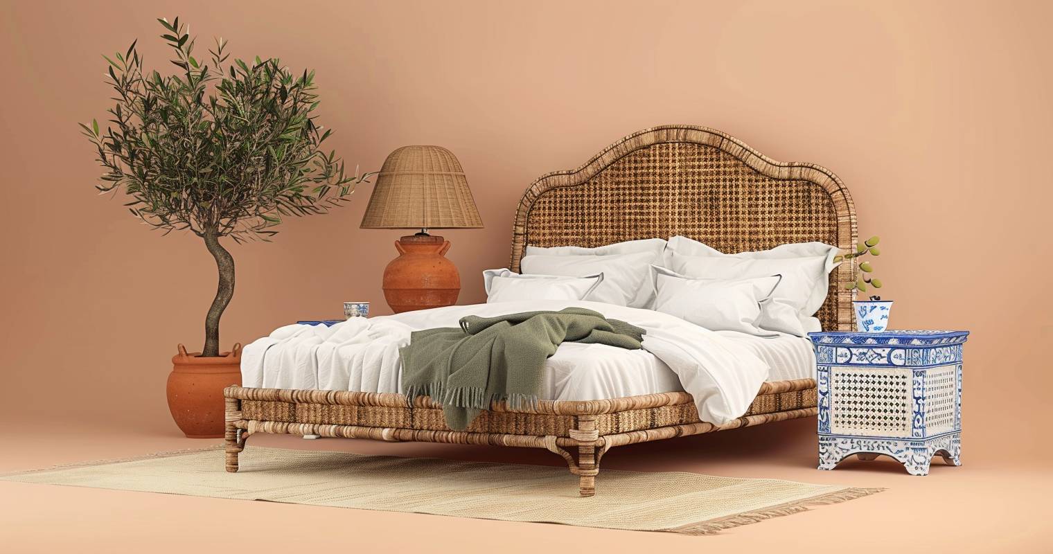 Setze Rattanmöbel im Schlafzimmer ein, um natürliche Wärme und Struktur zu schaffen. Das Material ist robust und bringt mediterranes Flair direkt zu dir. Rattan harmoniert mit Holz, Leinen und hellen Wänden. Wir wählen dazu Bettgestelle, Nachttische oder Körbe aus Rattan für ein stimmiges Gesamtbild.