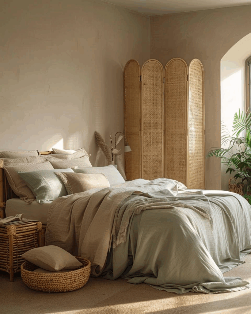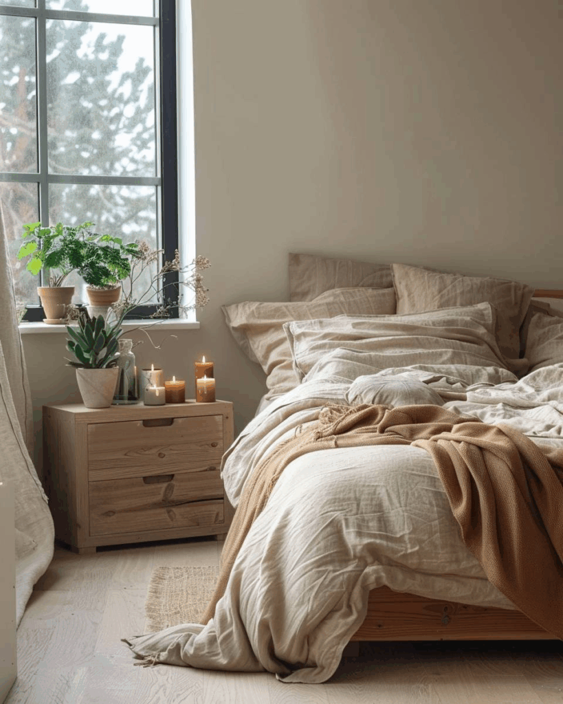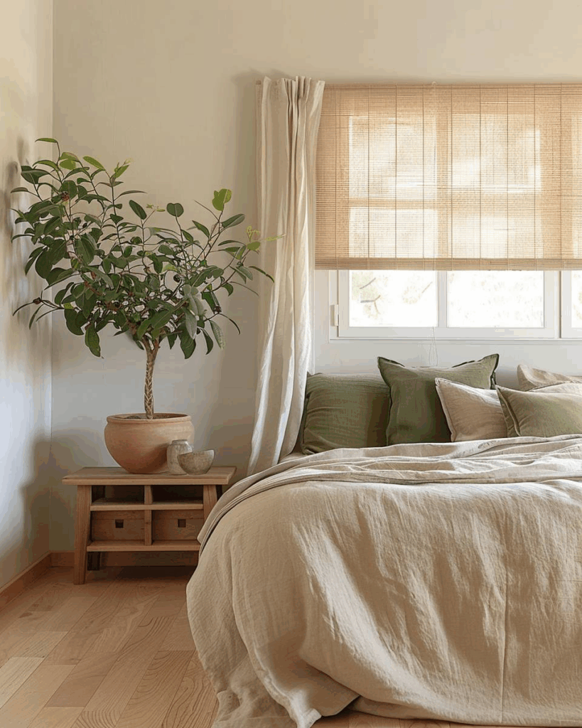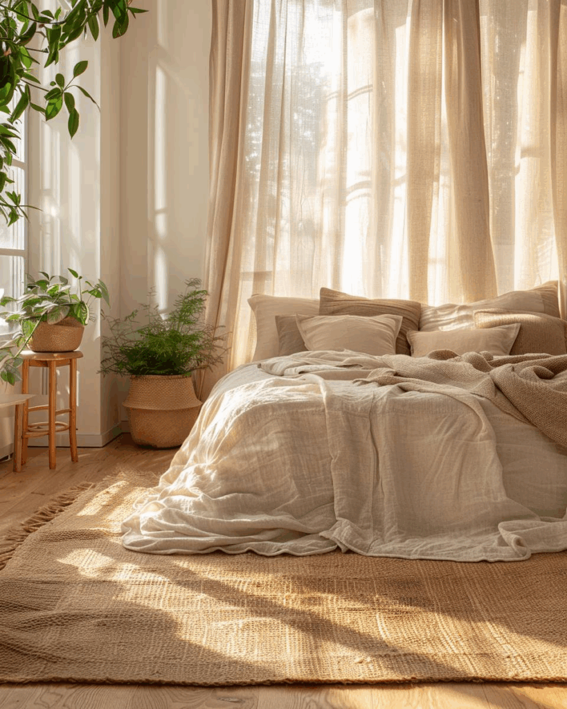 Sanfte Erdtöne, unbehandelte Holzmöbel und Leinenbettwäsche in Sandfarben sind starke Ansätze, um dein Schlafzimmer harmonisch einzurichten und mehr Ruhe zu schaffen.
