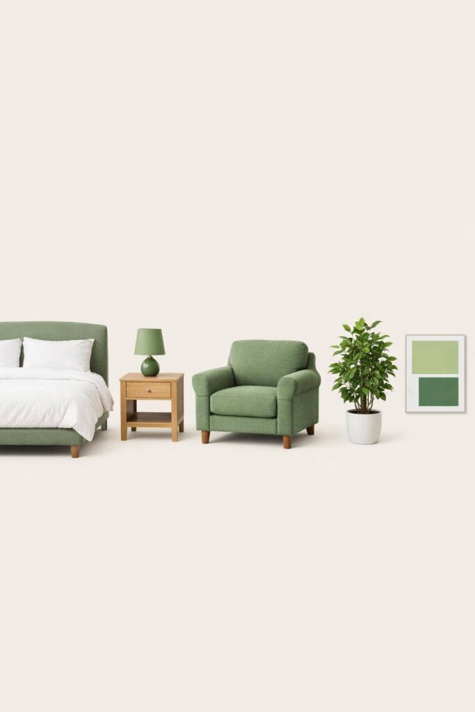 Nutze sanfte Moosgrüntöne für Bettwäsche, Vorhänge oder Kissen. Moosgrün wirkt ruhig und passt zu Holz, Leinen und Creme. Mische verschiedene Grüntöne und setze Akzente mit Naturmaterialien. Das gibt deinem Schlafzimmer direkt mehr Frische und eine entspannte Stimmung.