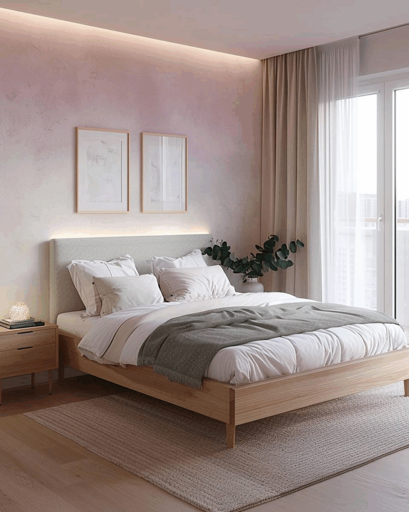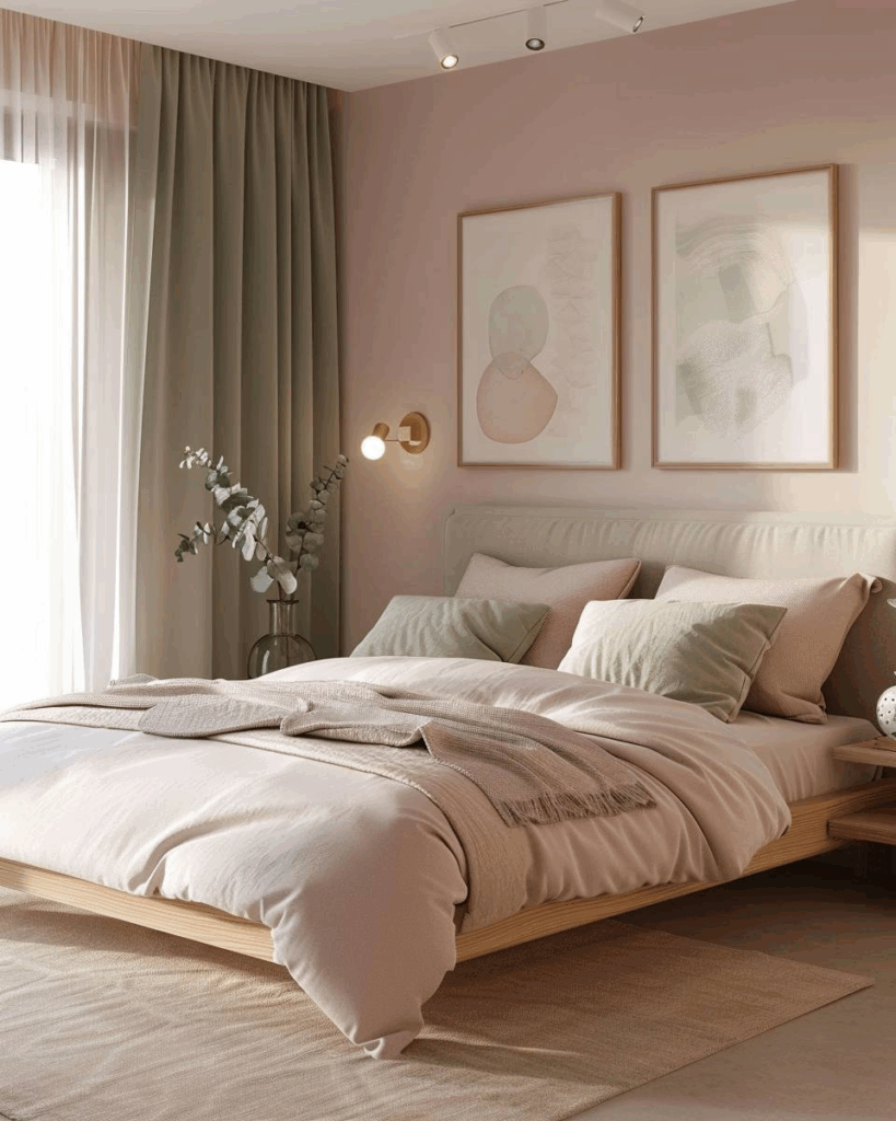 Nutze Naturholz für ruhige Pastellkontraste. Wir wählen geölte Eiche neben zartem Rosé an der Wand. Ein mattes Bettgestell und ein schlichter Nachttisch aus Eiche sind die Basis. Du ergänzt Leinen in Salbeigrün; warmweißes Licht ist sanft.